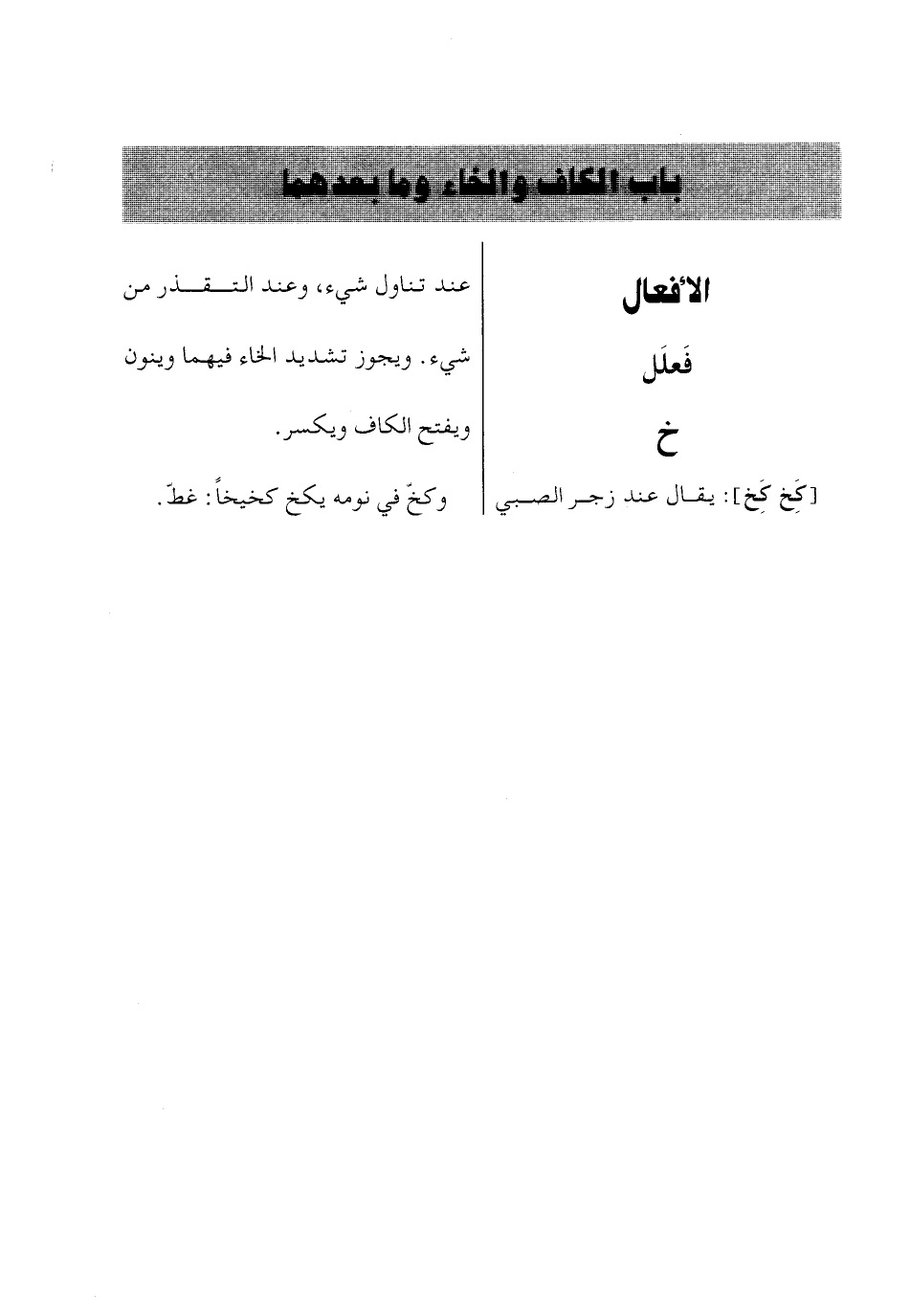 [كَخِ كَخِ]: يقال عند زجر الصبي عند تناول شيء، وعند التقذر من شيء. ويجوز تشديد الخاء فيهما وينون ويفتح الكاف ويكسر.