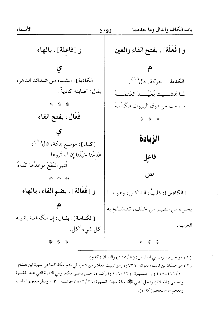 (2/ 421 - 424) والجمهرة: (2/ 1060)؛ وكداء: جبل بأعلى مكة، وهي الثنية التي عند المقبرة وتسمى (المعلاة) ودخل النبي صَلى الله عَليه وسلم مكة منها: السيرة: (2/ 406) حاشية- 3 - وانظر معجم البلدان ومعجم ما استعجم (كداء).