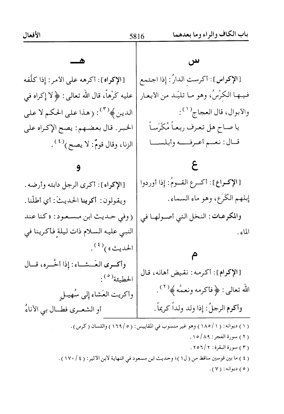 [الإِكراه]: أكرهه على الأمر: إِذا كلَّفه عليه كَرْهاً، قال اللّاه تعالى: لاا إِكْرااهَ فِي الدِّينِ «3»: (هذا على الحكم لا على الخبر. قال بعضهم: يصح الإِكراه على الزنا، وقال قومٌ: لا يصح) «4».
