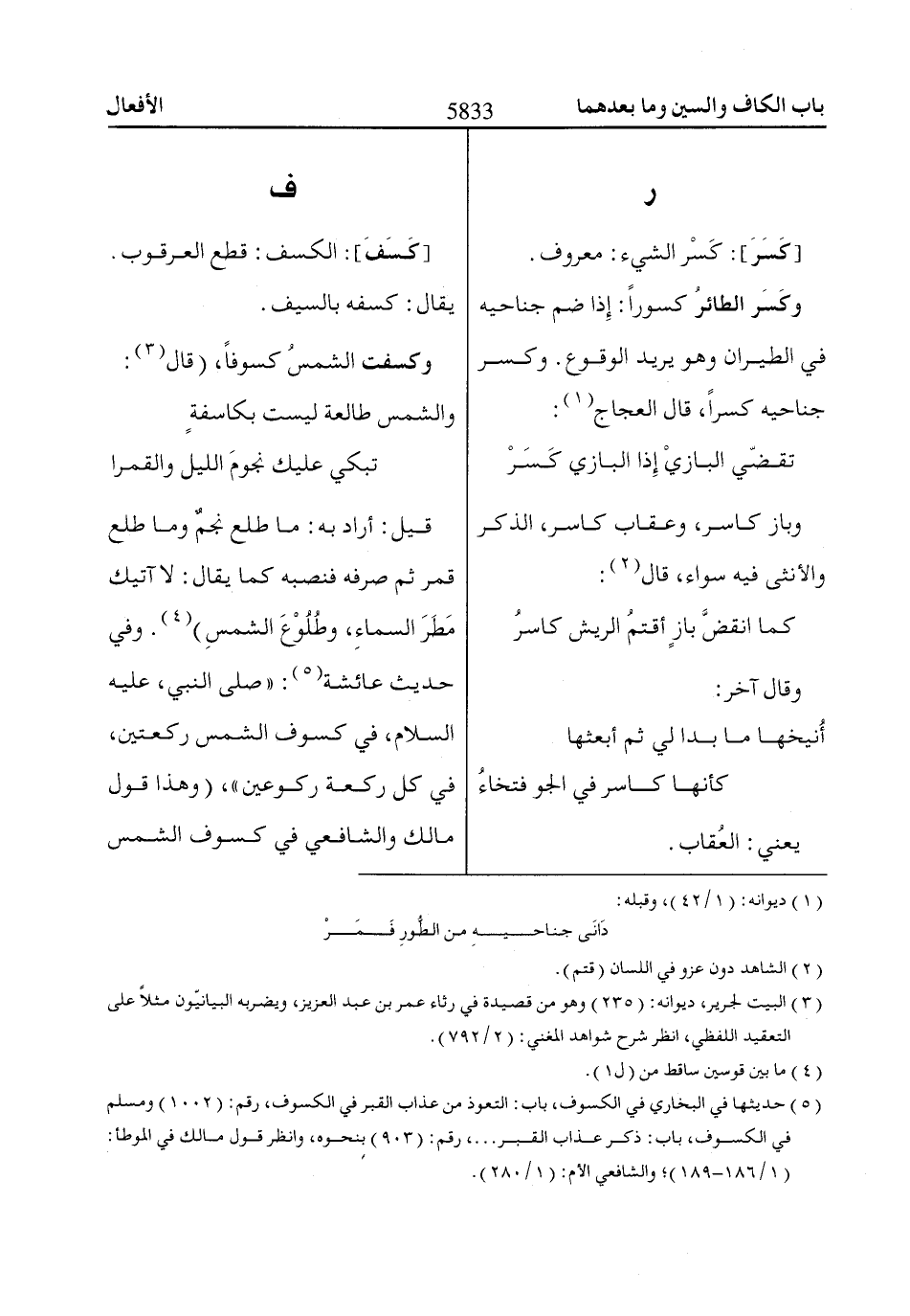وكَسَر الطائرُ كسوراً: إِذا ضم جناحيه في الطيران وهو يريد الوقوع. وكسر جناحيه كسراً، قال العجاج «1»: