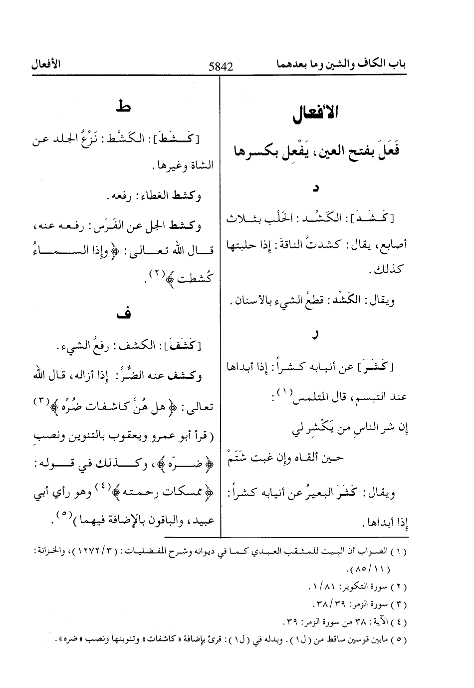 وكشف عنه الضُّرَّ: إِذا أزاله، قال اللّاه تعالى: هَلْ هُنَّ كااشِفااتُ ضُرِّهِ «3» (قرأ أبو عمرو ويعقوب بالتنوين ونصبِ ضرَّه، وكذلك في قوله: