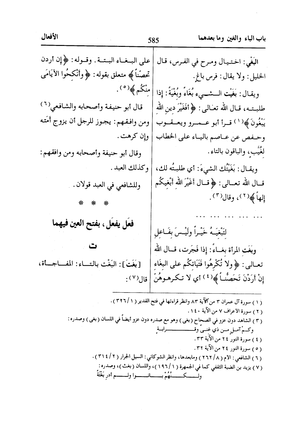 وبَغَتِ المرأة بِغاءً: إِذا فَجَرت، قال اللّاه تعالى: وَلاا تُكْرِهُوا فَتَيااتِكُمْ عَلَى الْبِغااءِ إِنْ أَرَدْنَ تَحَصُّناً «4» أي لا تكرهوهُنّ على البغاء البتة. وقوله: إِنْ أَرَدْنَ تَحَصُّناً متعلق بقوله: وَأَنْكِحُوا الْأَياامى مِنْكُمْ «5».