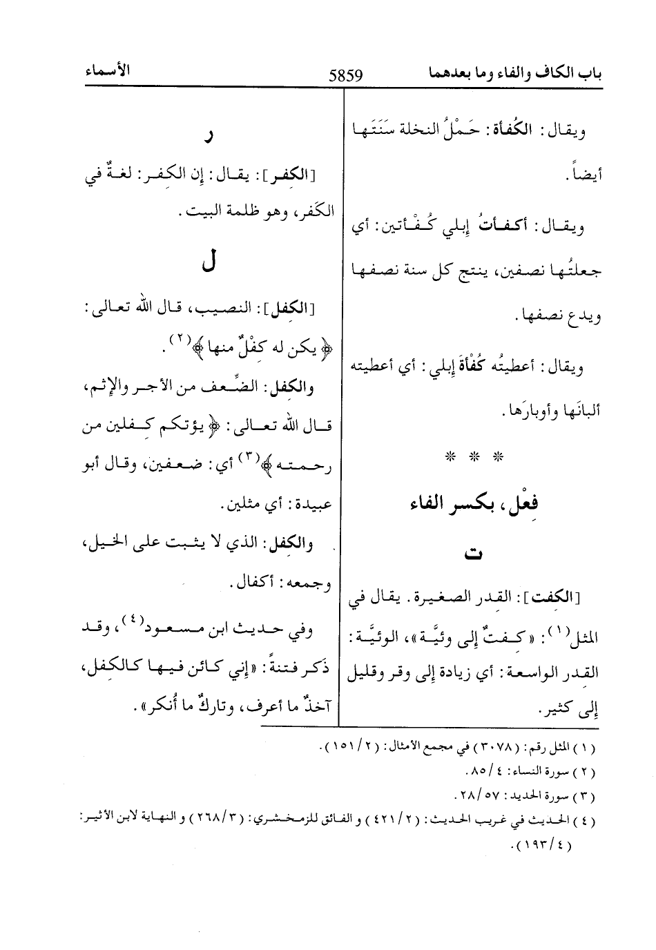 والكِفل: الضِّعف من الأجر والإِثم، قال اللّاه تعالى: يُؤْتِكُمْ كِفْلَيْنِ مِنْ رَحْمَتِهِ «3» أي: ضعفين، وقال أبو عبيدة: أي مثلين.