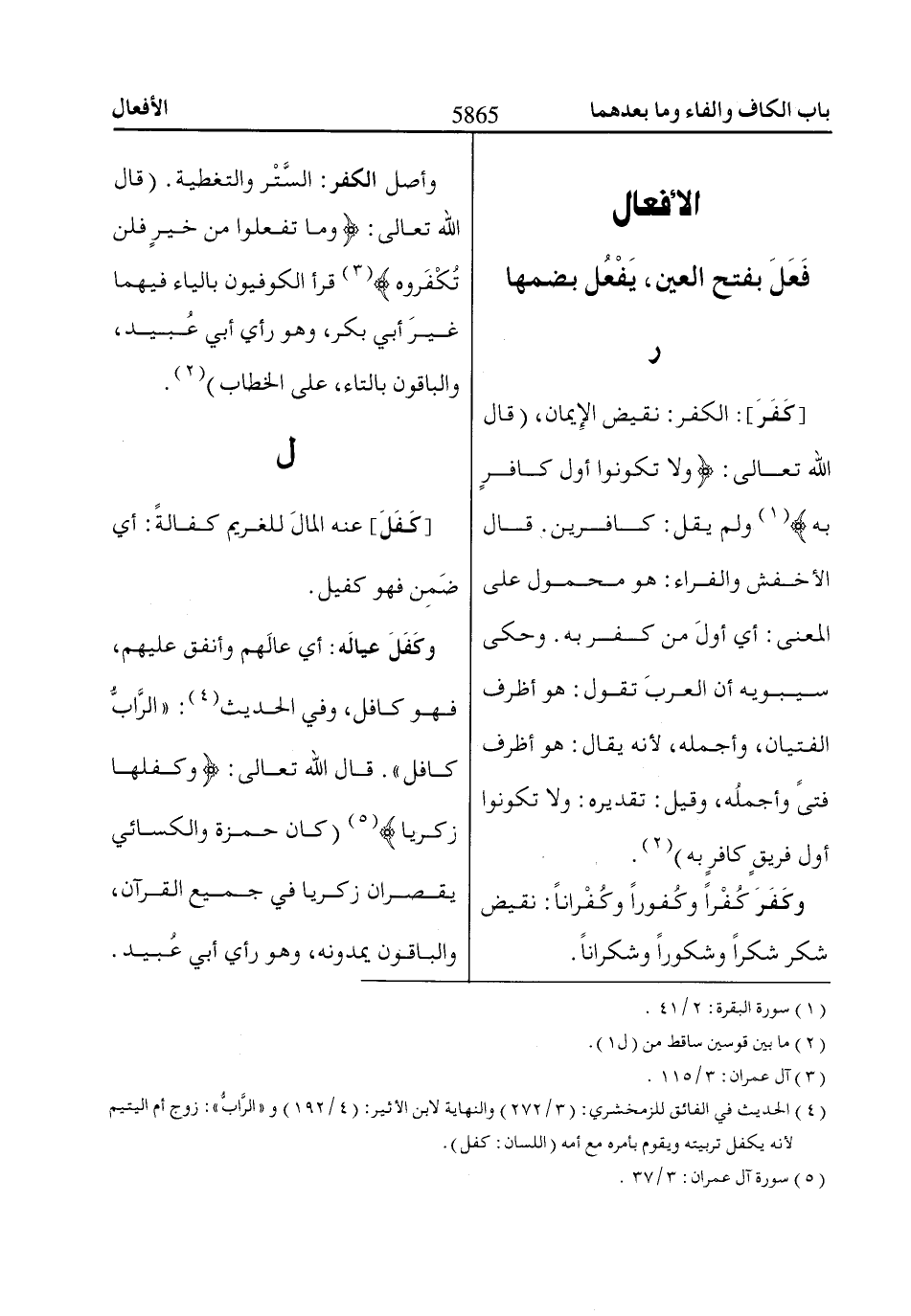 وأصل الكفر: السَّتْر والتغطية. (قال اللّاه تعالى: وما تفعلوا من خير فلن تكفروه «3» قرأ الكوفيون بالياء فيهما غيرَ أبي بكر، وهو رأي أبي عُبيد، والباقون بالتاء، على الخطاب) «2».