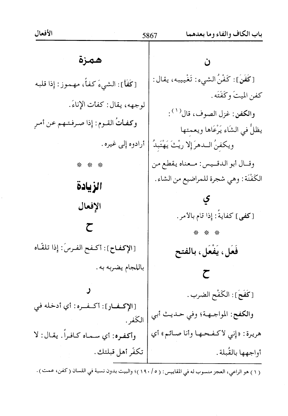 [كَفَأَ]: الشيءَ كفأً، مهموز: إِذا قلبه لوجهه، يقال: كفأت الإِناءَ.