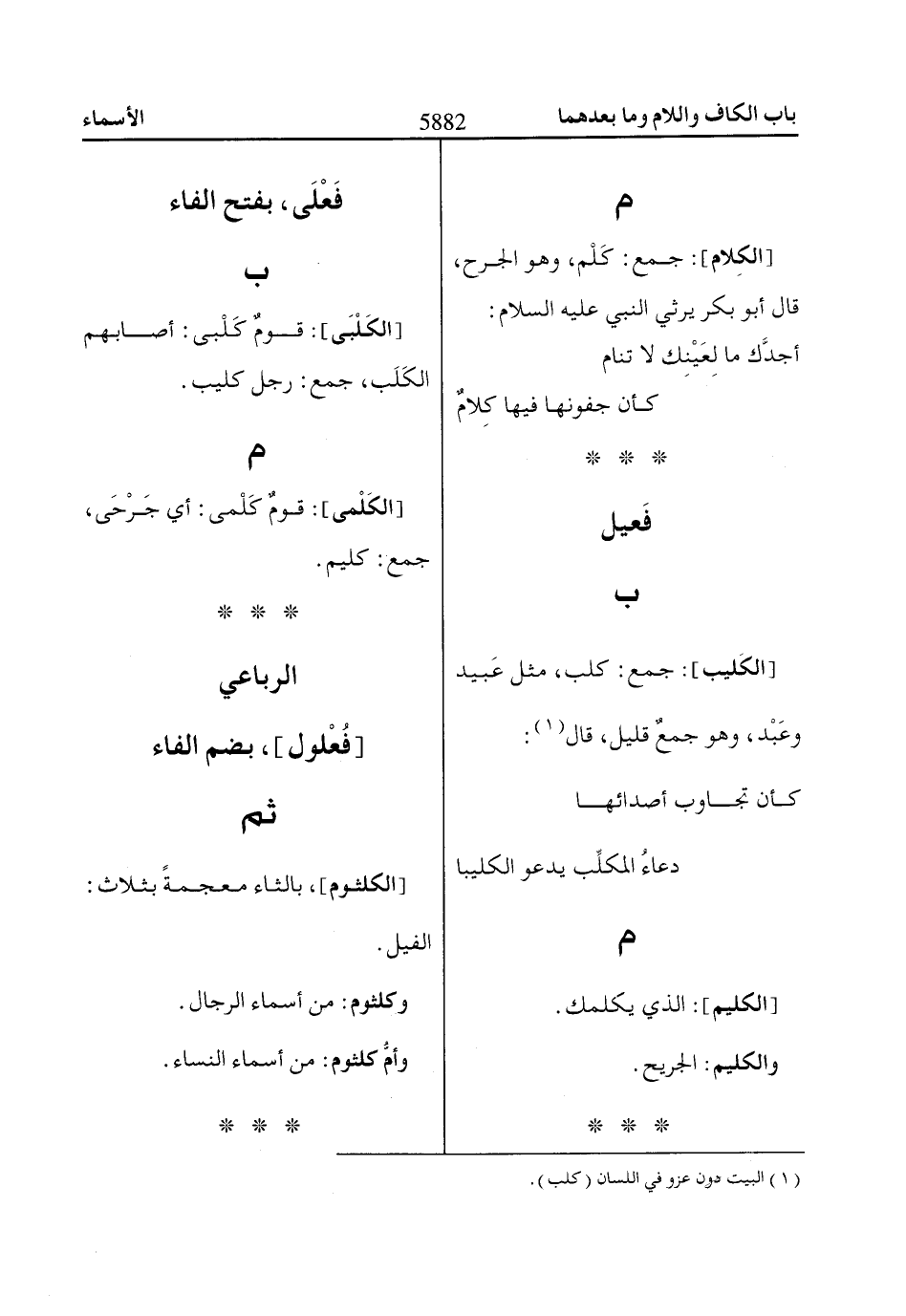 [الكَليب]: جمع: كلب، مثل عَبيد وعَبْد، وهو جمعٌ قليل، قال «1»:
