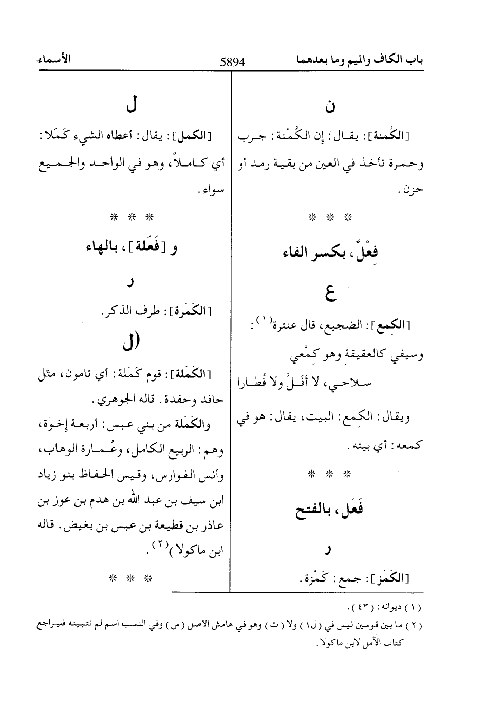 والكَمَلة من بني عبس: أربعة إِخوة، وهم: الربيع الكامل، وعُمارة الوهاب، وأنس الفوارس، وقيس الحفاظ بنو زياد ابن سيف بن عبد اللّاه بن هدم بن عوز بن عاذر بن قطيعة بن عبس بن بغيض. قاله ابن ماكولا) «2».