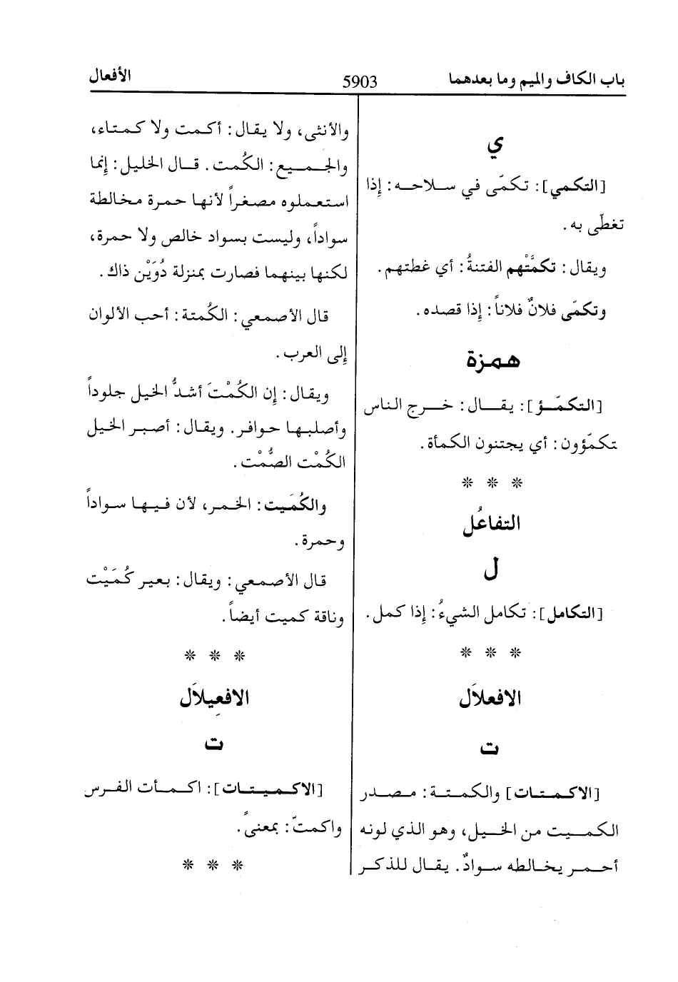 [الاكمتات] والكمتة: مصدر الكميت من الخيل، وهو الذي لونه أحمر يخالطه سوادٌ. يقال للذكر والأنثى، ولا يقال: أكمت ولا كمتاء، والجميع: الكُمت. قال الخليل: إِنما استعملوه مصغراً لأنها حمرة مخالطة سواداً، وليست بسواد خالص ولا حمرة، لكنها بينهما فصارت بمنزلة دُوَيْن ذاك.