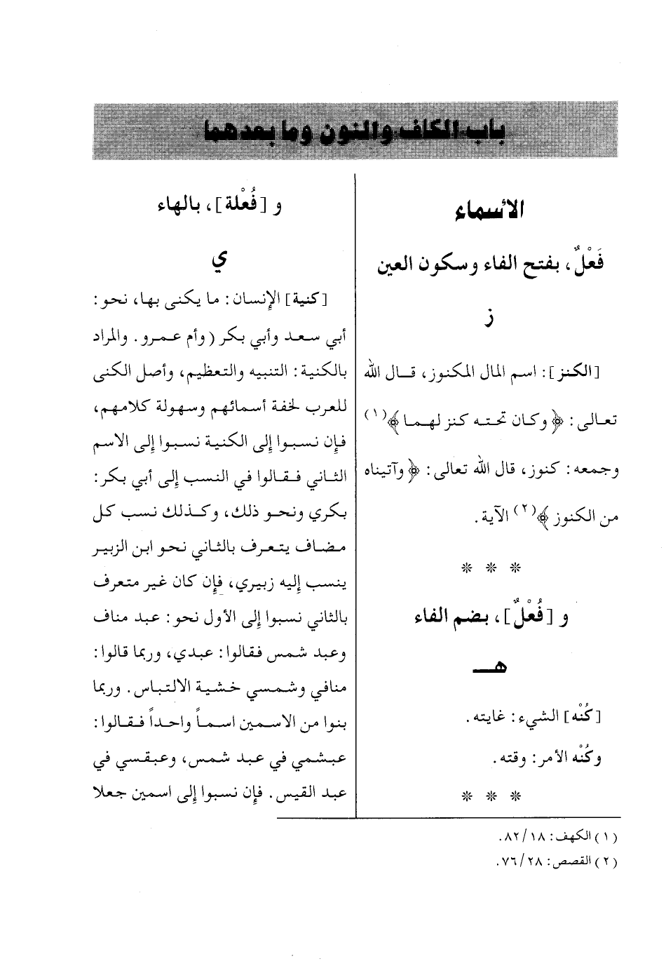 أبي سعد وأبي بكر (وأم عمرو. والمراد بالكنية: التنبيه والتعظيم، وأصل الكنى للعرب لخفة أسمائهم وسهولة كلامهم، فإِن نسبوا إِلى الكنية نسبوا إِلى الاسم الثاني فقالوا في النسب إِلى أبي بكر: