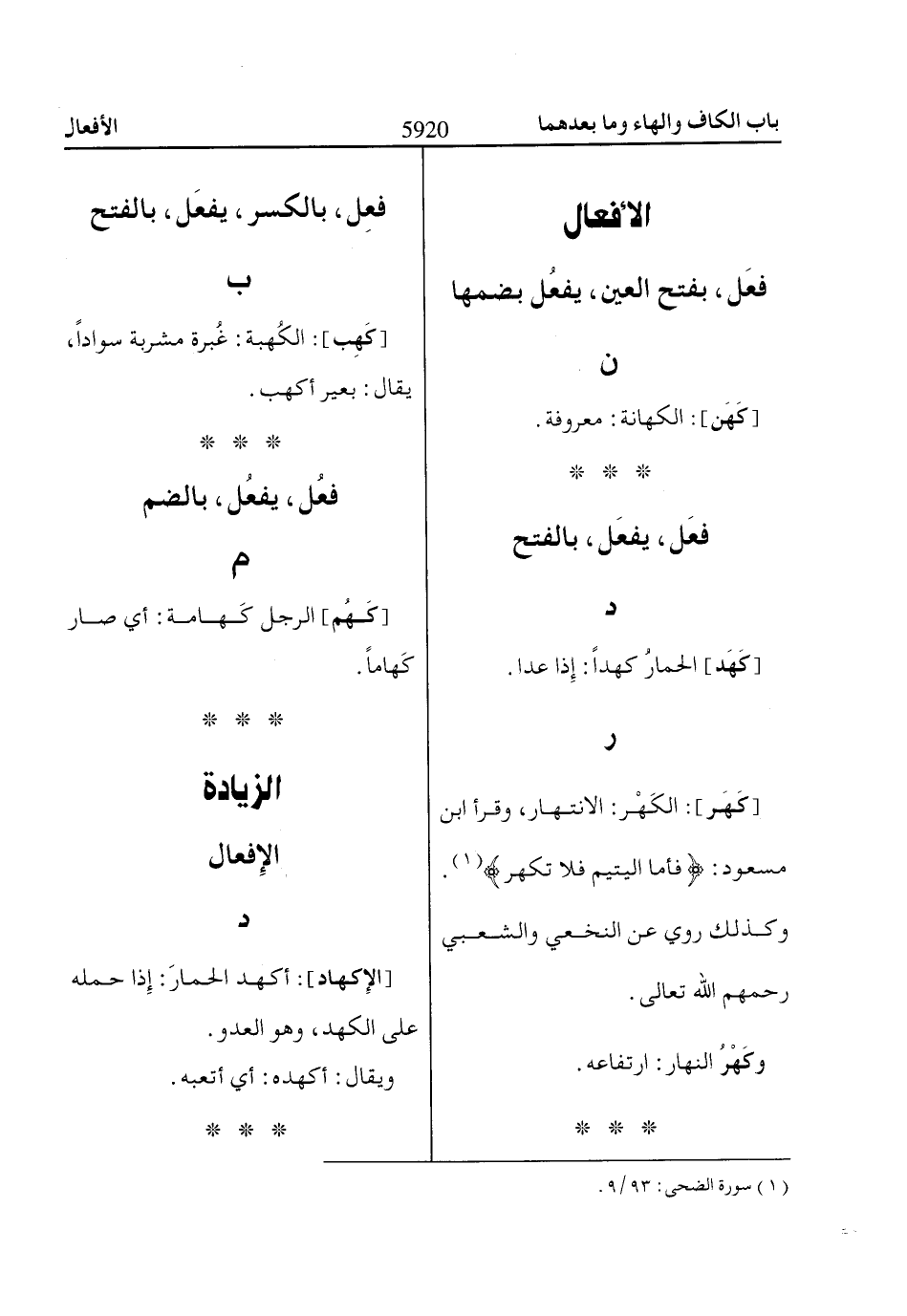 [كَهَر]: الكَهْر: الانتهار، وقرأ ابن مسعود: فأما اليتيم فلا تكهر «1».