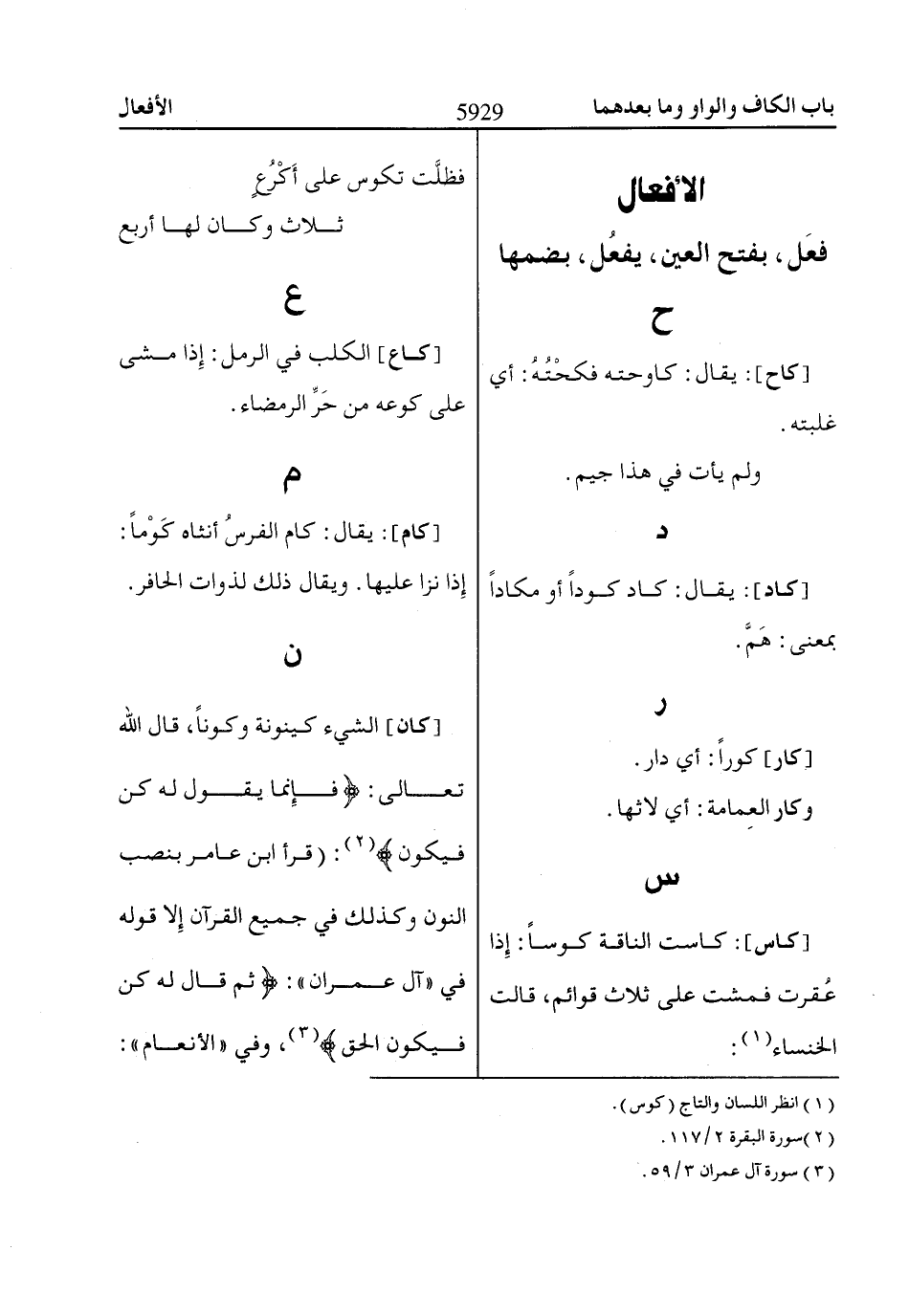 [كان] الشيء كينونة وكوناً، قال اللّاه تعالى: فَإِنَّماا يَقُولُ لَهُ كُنْ فَيَكُونُ* «2»: (قرأ ابن عامر بنصب النون وكذلك في جميع القرآن إِلا قوله في «آل عمران»: ثُمَّ قاالَ لَهُ كُنْ فَيَكُونُ الْحَقُّ «3»، وفي «الأنعام»: