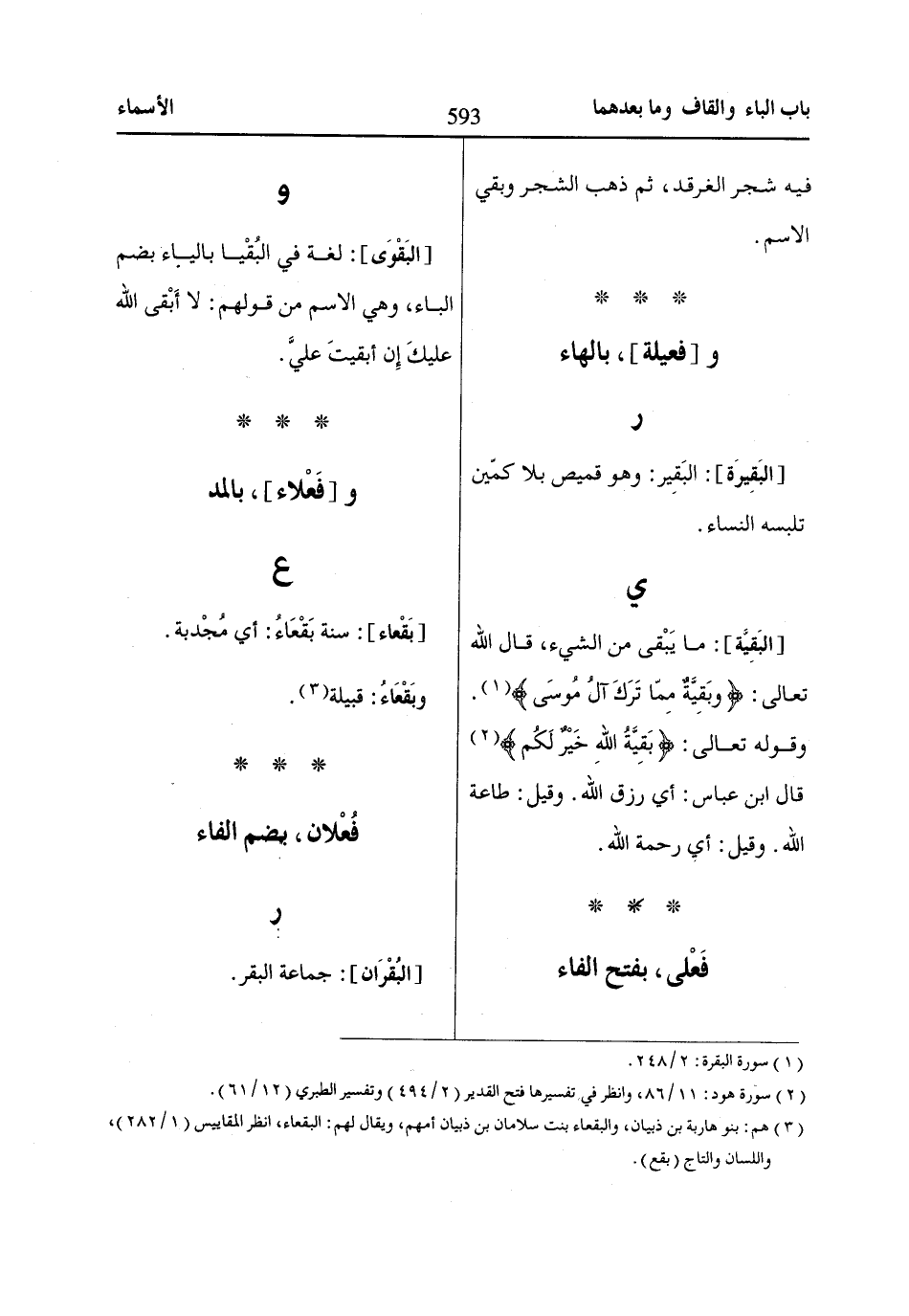 و [البَقْوَى]: لغة في البُقْيا بالياء بضم الباء، وهي الاسم من قولهم: لا أَبْقى اللّاه عليكَ إِن أبقيتَ عليَّ.