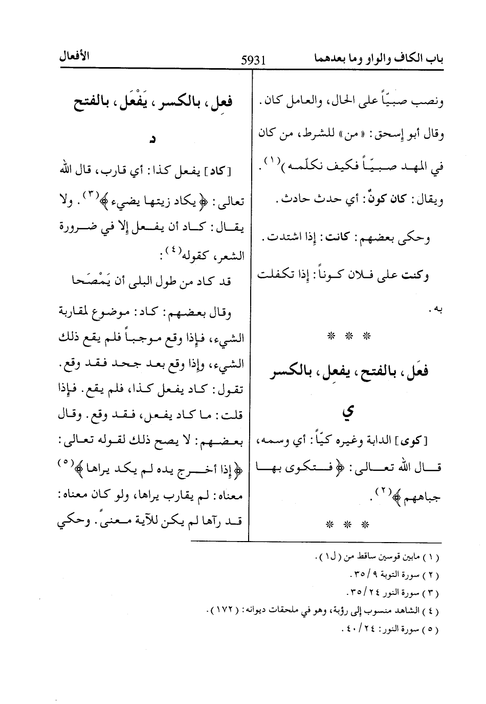 [كاد] يفعل كذا: أي قارب، قال اللّاه تعالى: يَكاادُ زَيْتُهاا يُضِيءُ «3». ولا يقال: كاد أن يفعل إِلا في ضرورة الشعر، كقوله «4»: