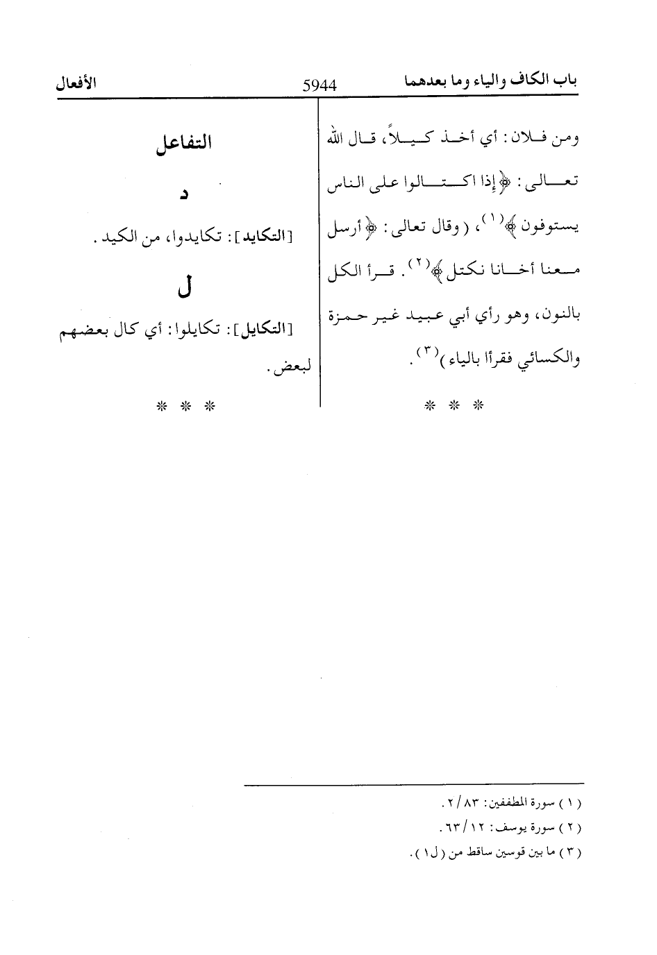 ومن فلان: أي أخذ كيلًا، قال اللّاه تعالى: إِذَا اكْتاالُوا عَلَى النّااسِ يَسْتَوْفُونَ «1»، (وقال تعالى: فَأَرْسِلْ مَعَناا أَخااناا نَكْتَلْ «2». قرأ الكل بالنون، وهو رأي أبي عبيد غير حمزة والكسائي فقرأ بالياء) «3».