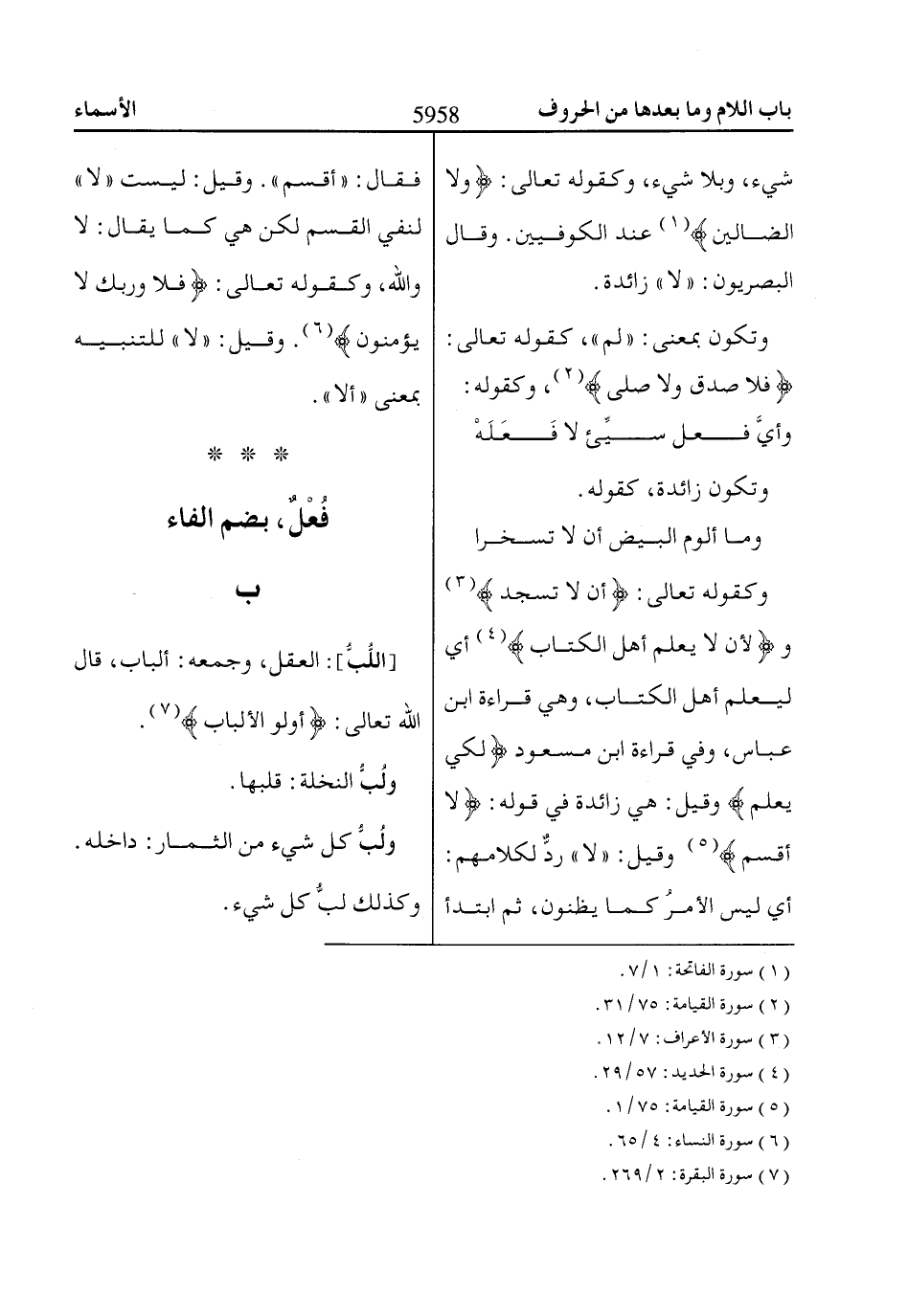 [اللُّبُّ]: العقل، وجمعه: ألباب، قال اللّاه تعالى: أُولُوا الْأَلْباابِ* «7».