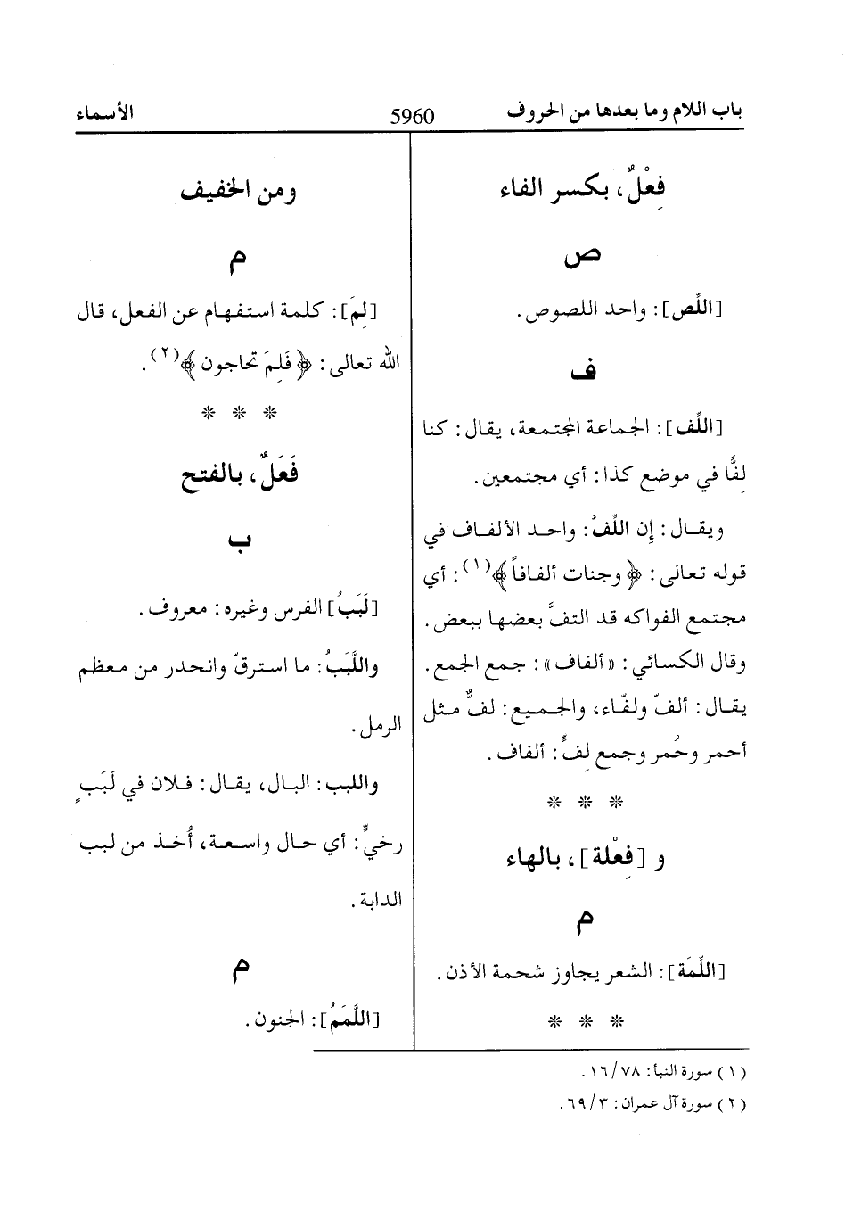 ويقال: إِن اللِّفَّ: واحد الألفاف في قوله تعالى: وَجَنّااتٍ أَلْفاافاً «1»: أي مجتمع الفواكه قد التفَّ بعضها ببعض.