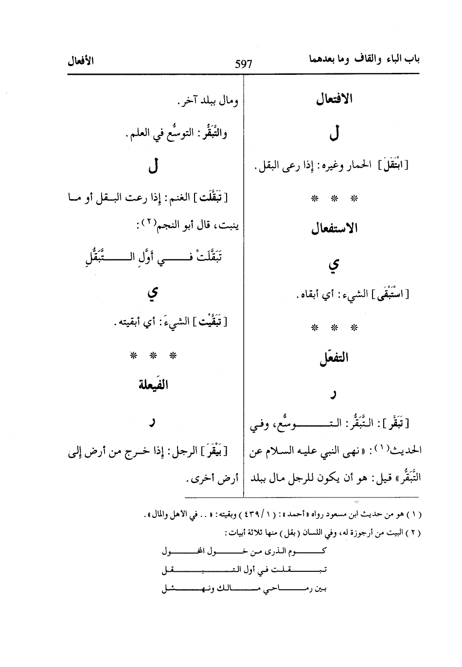 [تَبَقَّلَت] الغنم: إِذا رعت البقل أو ما ينبت، قال أبو النجم «2»: