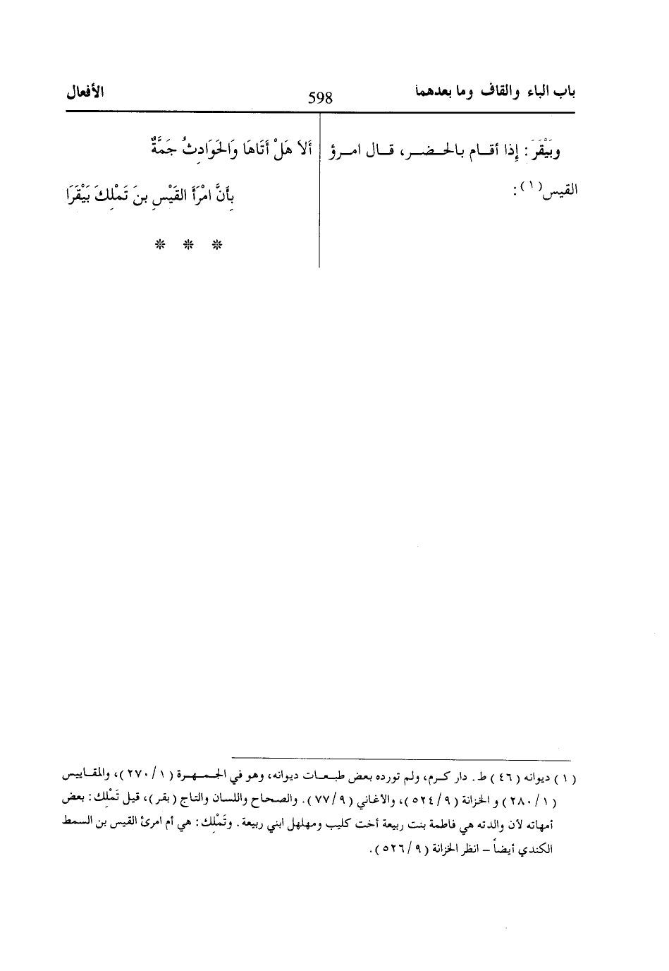 (1) ديوانه (46) ط. دار كرم، ولم تورده بعض طبعات ديوانه، وهو في الجمهرة (1/ 270)، والمقاييس (1/ 280) والخزانة (9/ 524)، والأغاني (9/ 77). والصحاح واللسان والتاج (بقر)، قيل تَمْلِك: بعض أمهاته لأن والدته هي فاطمة بنت ربيعة أخت كليب ومهلهل ابني ربيعة. وتَمْلِك: هي أم امرئ القيس بن السمط الكندي أيضاً- انظر الخزانة (9/ 526).
