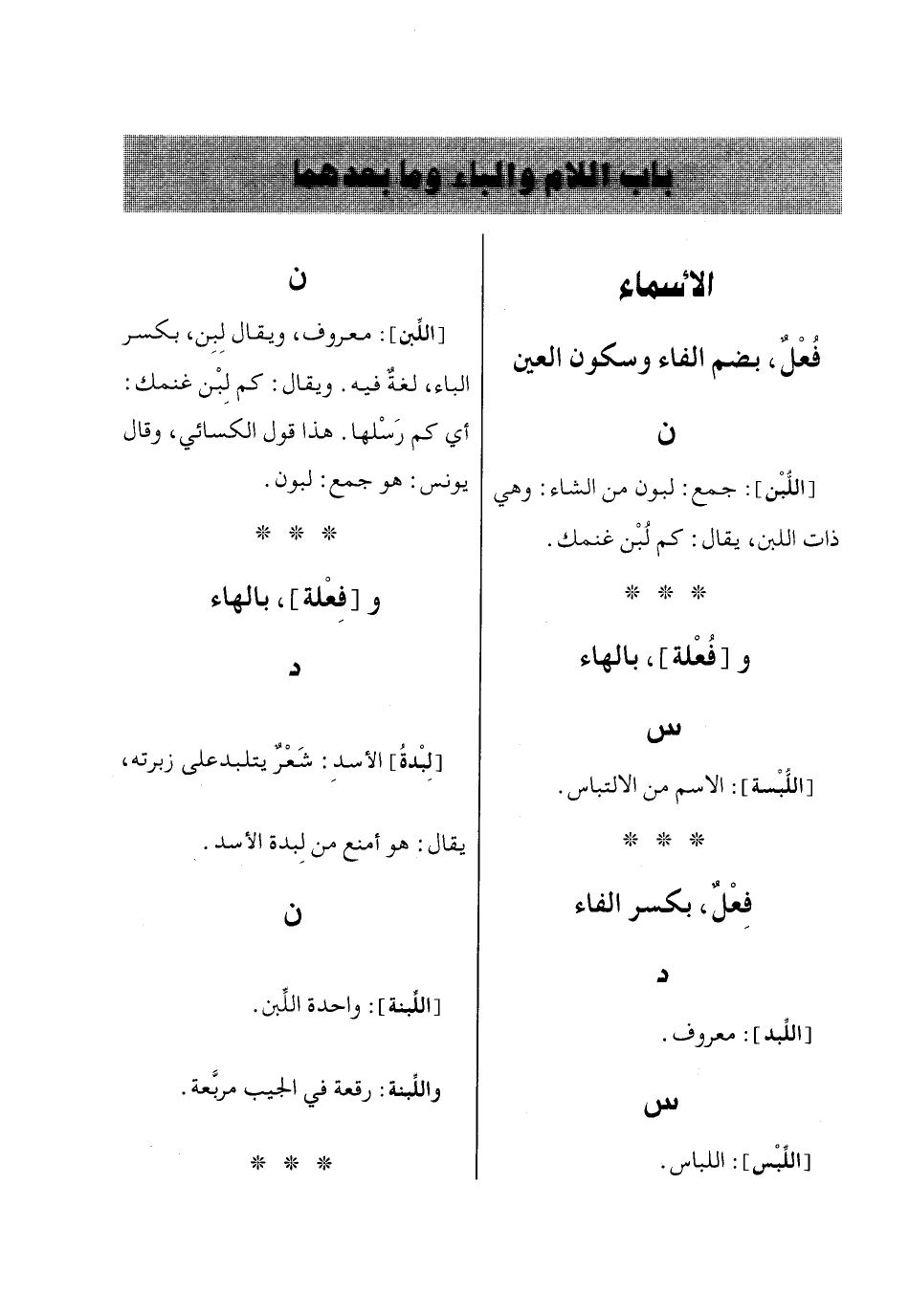 [اللِّبن]: معروف، ويقال لِبِن، بكسر الباء، لغةٌ فيه. ويقال: كم لِبْن غنمك:
