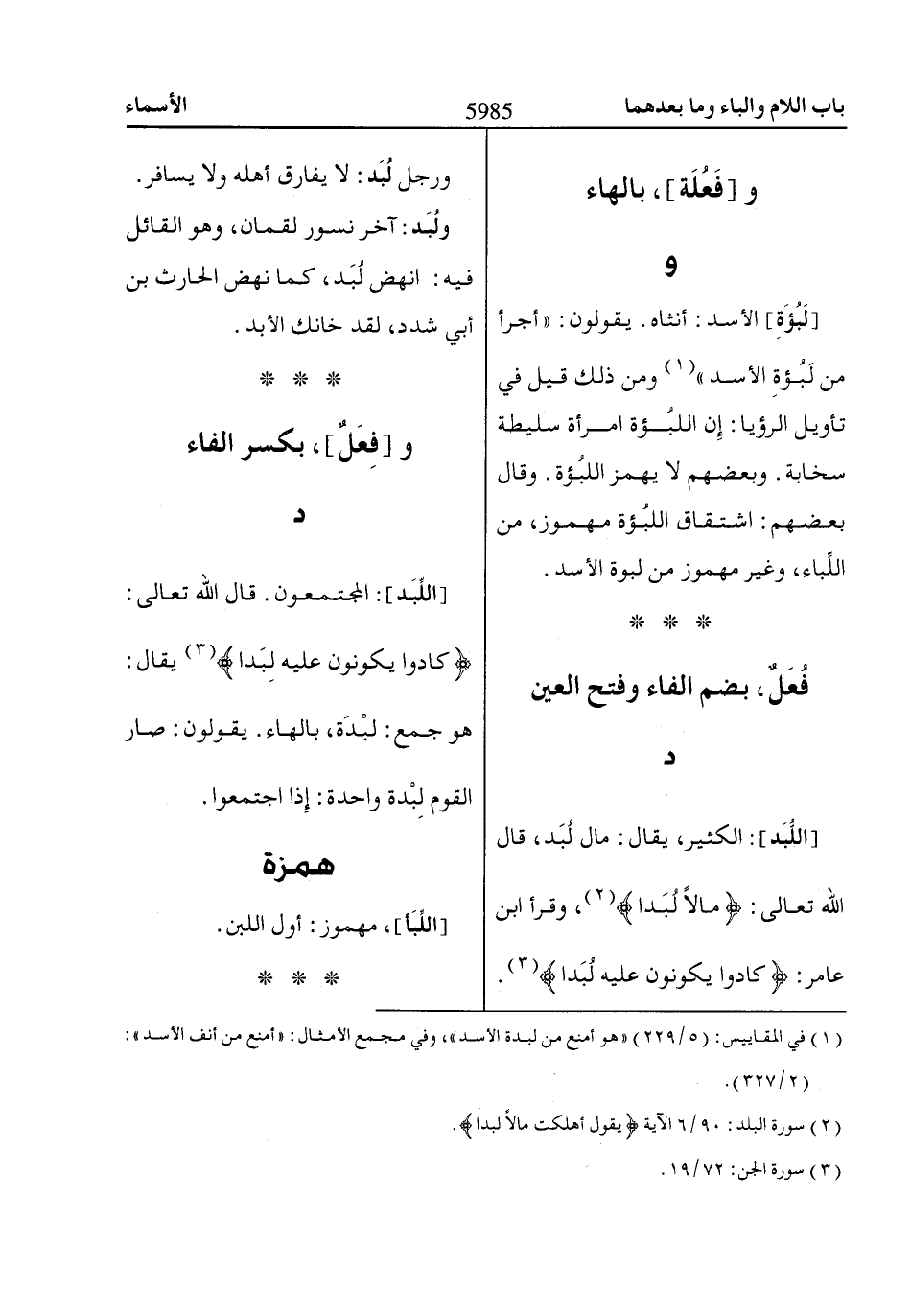 و [لَبُؤَةِ] الأسد: أنثاه. يقولون: «أجرأ من لَبُؤةِ الأسد» «1» ومن ذلك قيل في تأويل الرؤيا: إِن اللبُؤة امرأة سليطة سخابة. وبعضهم لا يهمز اللبُؤة. وقال بعضهم: اشتقاق اللبُؤة مهموز، من اللِّباء، وغير مهموز من لبوة الأسد.
