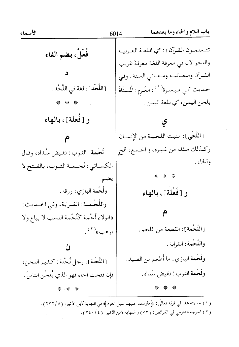 [اللُّحْنة]: رجل لُحْنة: كثير اللحن، فإِن فتحت الحاء فهو الذي يُلحِّن الناسَ.