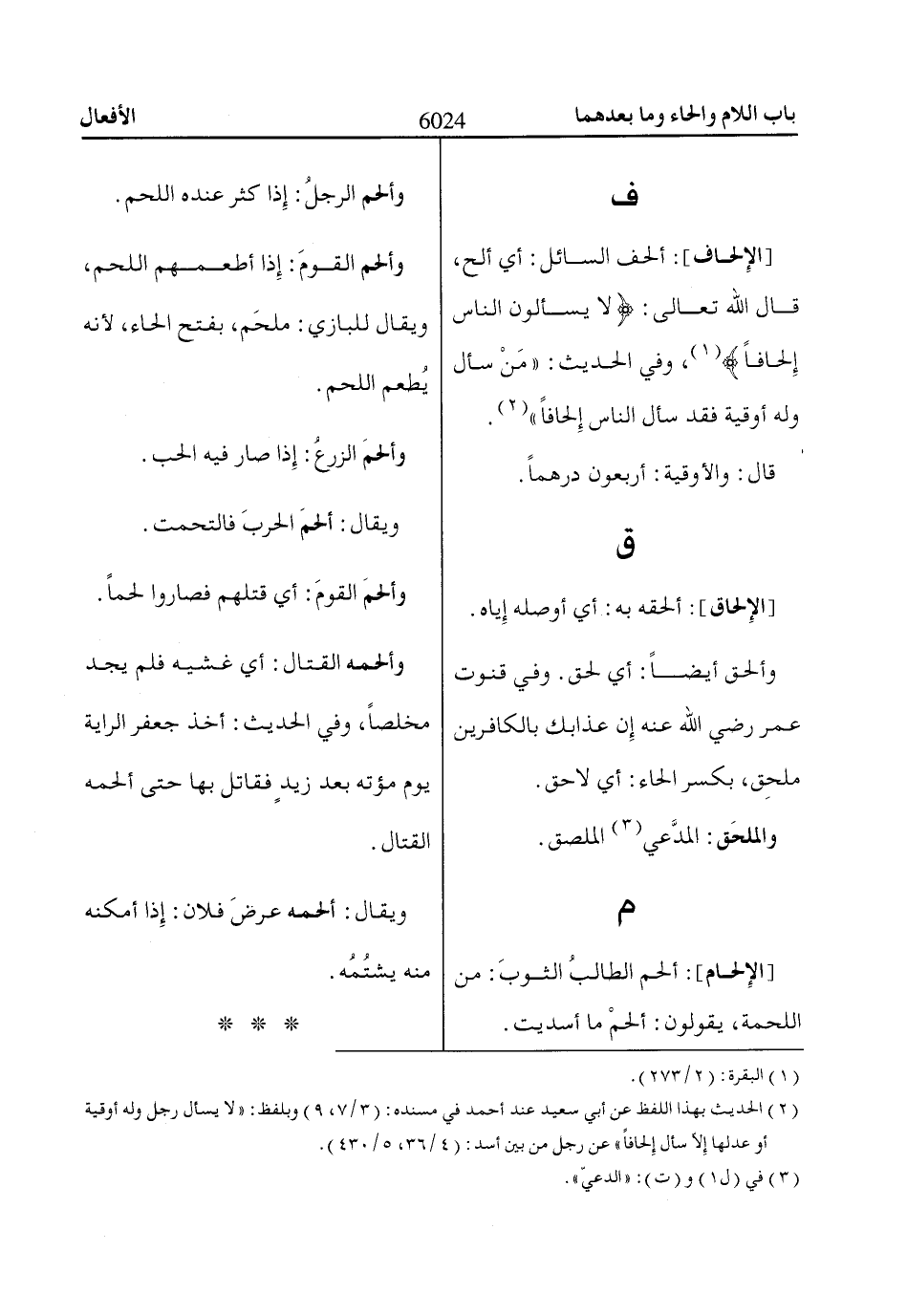 [الإِلحاف]: ألحف السائل: أي ألح، قال اللّاه تعالى: لاا يَسْئَلُونَ النّااسَ إِلْحاافاً «1»،