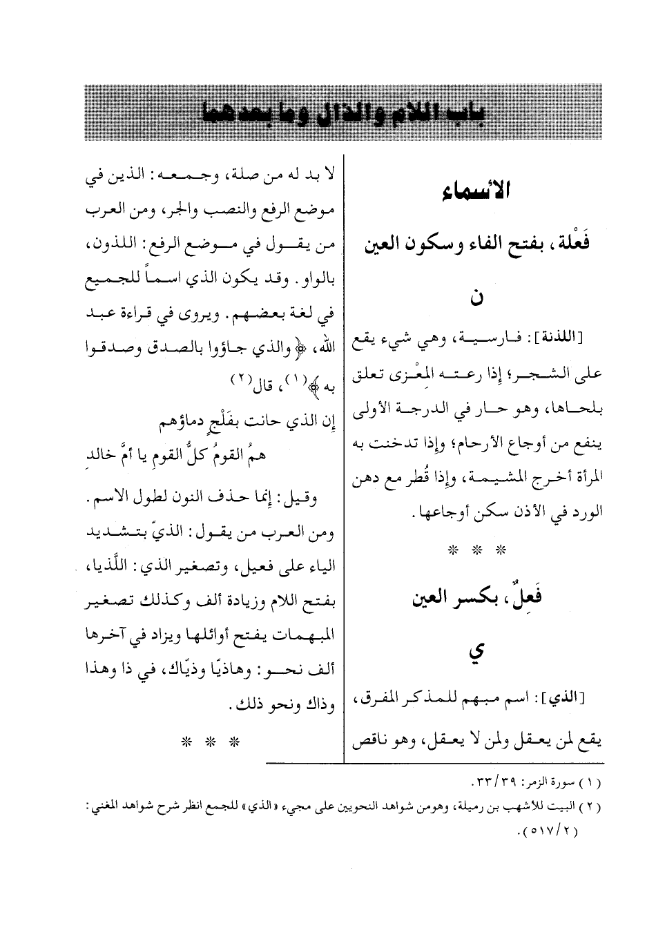 [الذي]: اسم مبهم للمذكر المفرق، يقع لمن يعقل ولمن لا يعقل، وهو ناقص لا بد له من صلة، وجمعه: الذين في موضع الرفع والنصب والجر، ومن العرب من يقول في موضع الرفع: اللذون، بالواو. وقد يكون الذي اسماً للجميع في لغة بعضهم. ويروى في قراءة عبد اللّاه، والذي جاؤوا بالصدق وصدقوا به «1»، قال «2»