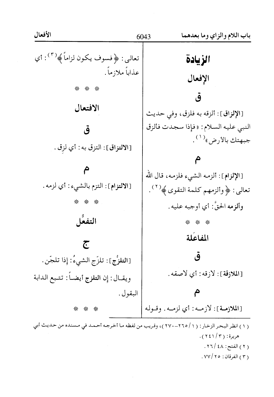 [الملازمة]: لازمه: أي لزمه. وقوله تعالى: فَسَوْفَ يَكُونُ لِزااماً «3»: أي عذاباً ملازماً.