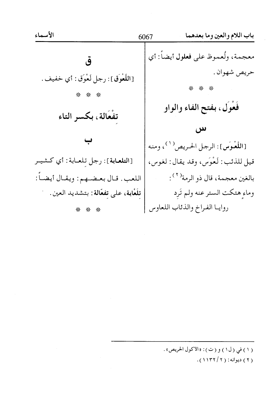 [اللَّعْوَس]: الرجل الحريص «1»، ومنه قيل للذئب: لَعْوَس، وقد يقال: لغوس، بالغين معجمة، قال ذو الرمة «2»: