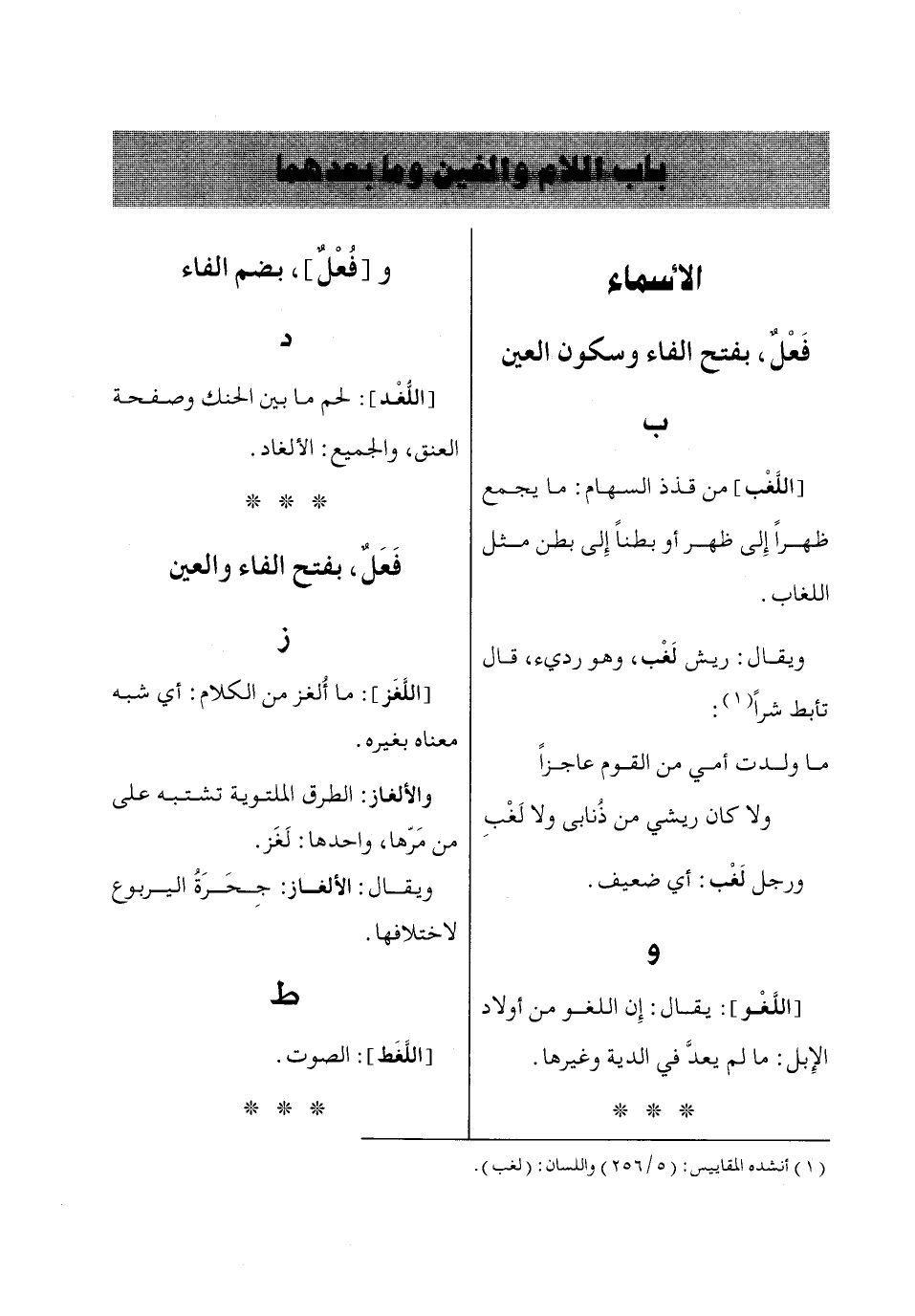 [اللَّغْب] من قذذ السهام: ما يجمع ظهراً إِلى ظهر أو بطناً إِلى بطن مثل اللغاب.