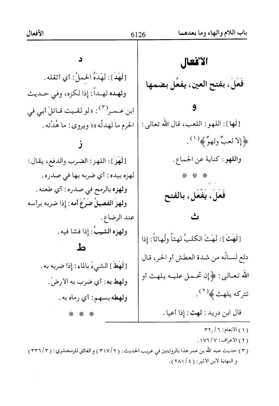 [لَهَثَ]: لَهَثَ الكلبُ لهثاً ولُهاثاً: إِذا دلِع لسانُه من شدة العطش أو الحر، قال اللّاه تعالى: إِنْ تَحْمِلْ عَلَيْهِ يَلْهَثْ أَوْ تَتْرُكْهُ يَلْهَثْ «2».