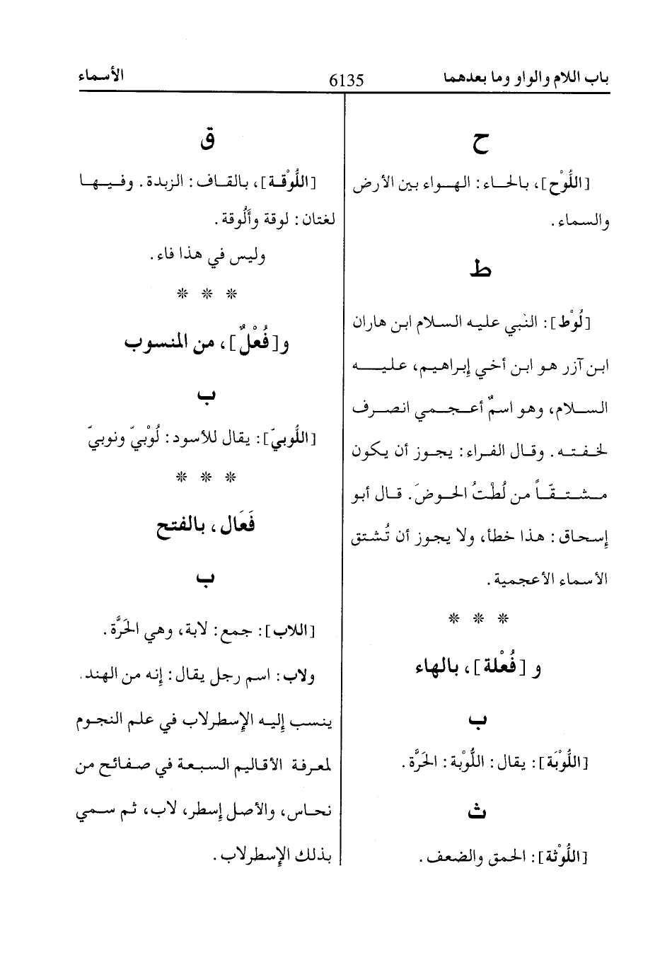 [لُوْط]: النبي عليه السلام ابن هاران ابن آزر هو ابن أخي إِبراهيم، عليه السلام، وهو اسمٌ أعجمي انصرف لخفته. وقال الفراء: يجوز أن يكون مشتقّاً من لُطْتُ الحوضَ. قال أبو إِسحاق: هذا خطأ، ولا يجوز أن تُشتق الأسماء الأعجمية.