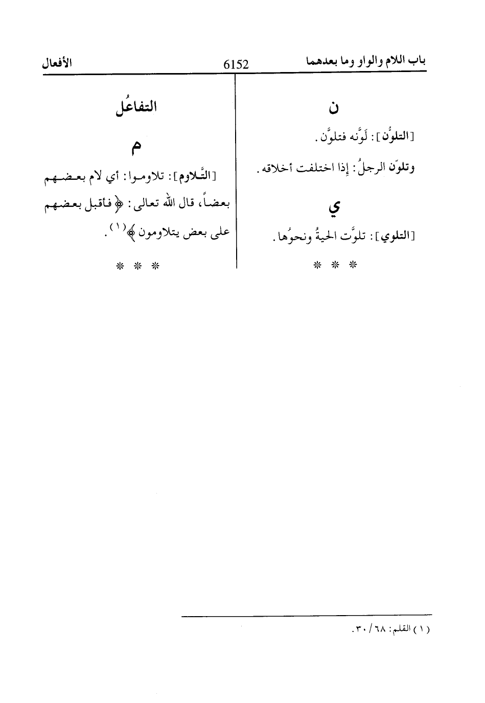 [التَّلاوم]: تلاوموا: أي لام بعضهم بعضاً، قال اللّاه تعالى: فَأَقْبَلَ بَعْضُهُمْ عَلى بَعْضٍ يَتَلااوَمُونَ «1».