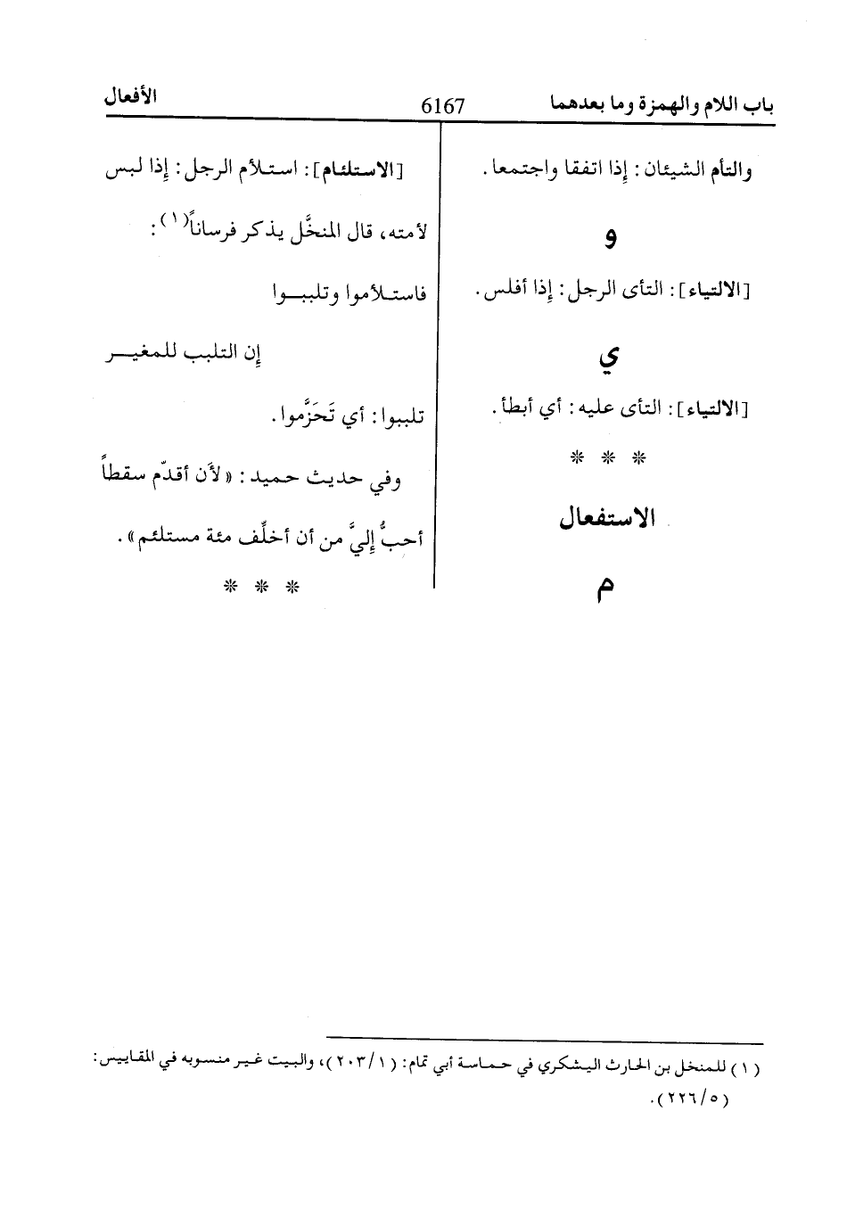 [الاستلئام]: استلأم الرجل: إِذا لبس لأمته، قال المنخَّل يذكر فرساناً «1»: