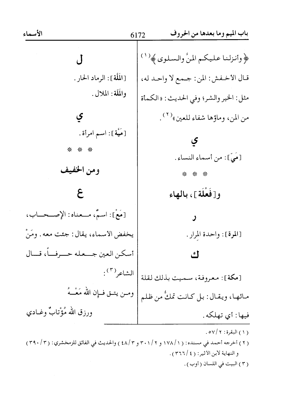وَأَنْزَلْناا عَلَيْكُمُ الْمَنَّ وَالسَّلْوى «1» قال الأخفش: المن: جمع لا واحد له، مثل: الخير والشر؛