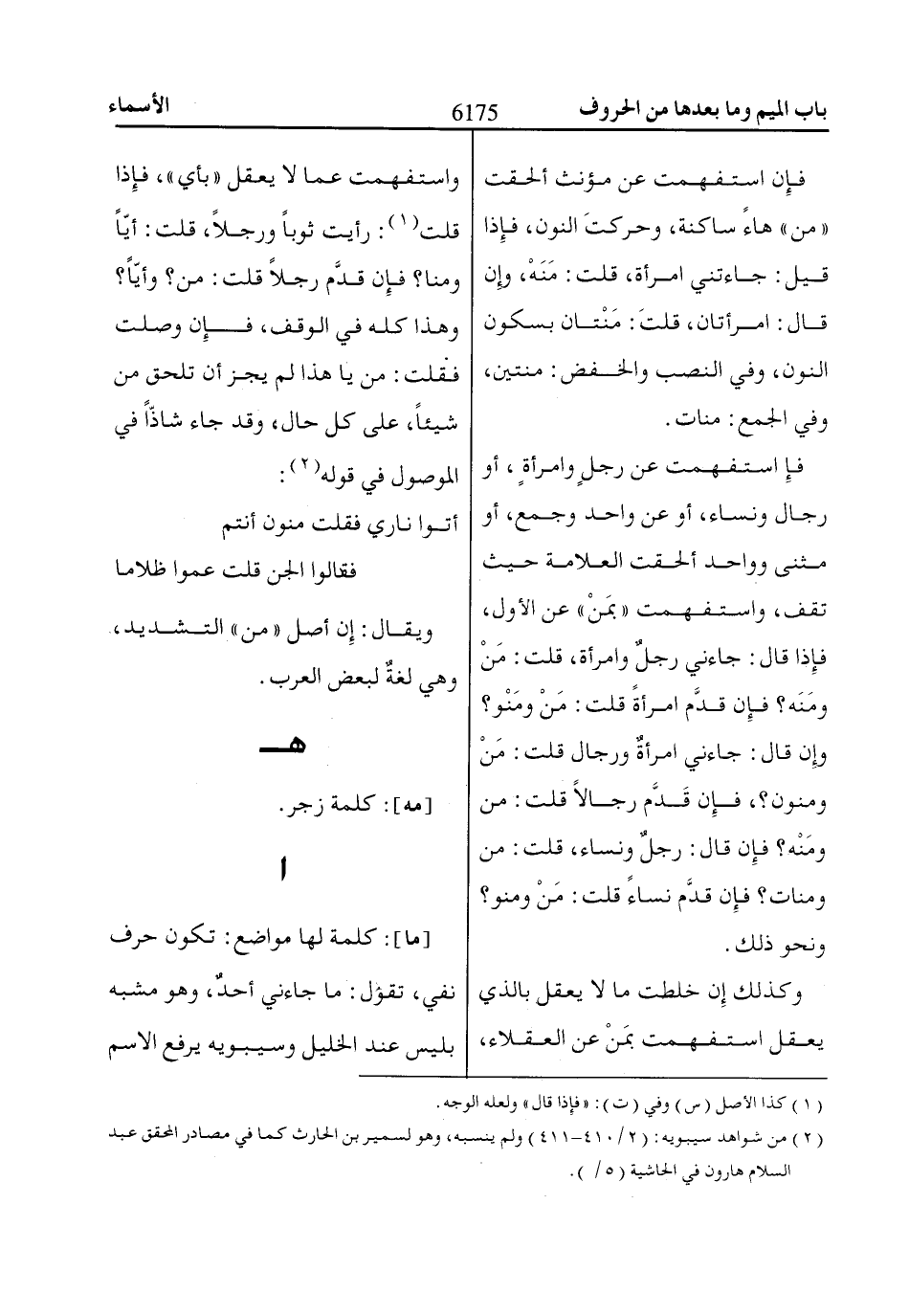 فإِ استفهمت عن رجلٍ وامرأةٍ، أو رجال ونساء، أو عن واحد وجمع، أو مثنى وواحد ألحقت العلامة حيث تقف، واستفهمت «بمَنْ» عن الأول، فإِذا قال: جاءني رجلٌ وامرأة، قلت: مَنْ ومَنَه؟ فإِن قدَّم امرأةً قلت: مَنْ ومَنْو؟