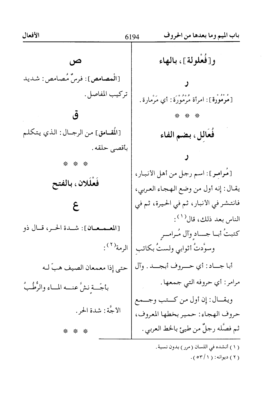 [مُرامِر]: اسم رجل من أهل الأنبار، يقال: إِنه أول من وضع الهجاء العربي، فانتشر في الأنبار، ثم في الحيرة، ثم في الناس بعد ذلك، قال «1»: