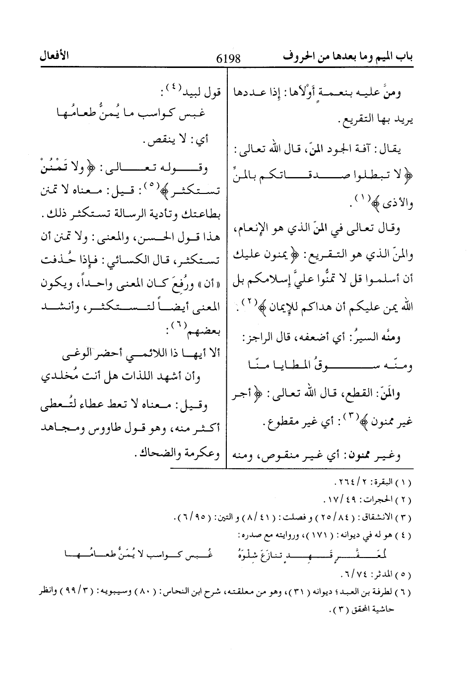 وقال تعالى في المنّ الذي هو الإِنعام، والمنّ الذي هو التقريع: يَمُنُّونَ عَلَيْكَ أَنْ أَسْلَمُوا قُلْ لاا تَمُنُّوا عَلَيَّ إِسْلاامَكُمْ بَلِ اللّاهُ يَمُنُّ عَلَيْكُمْ أَنْ هَدااكُمْ لِلْإِيماانِ «2».