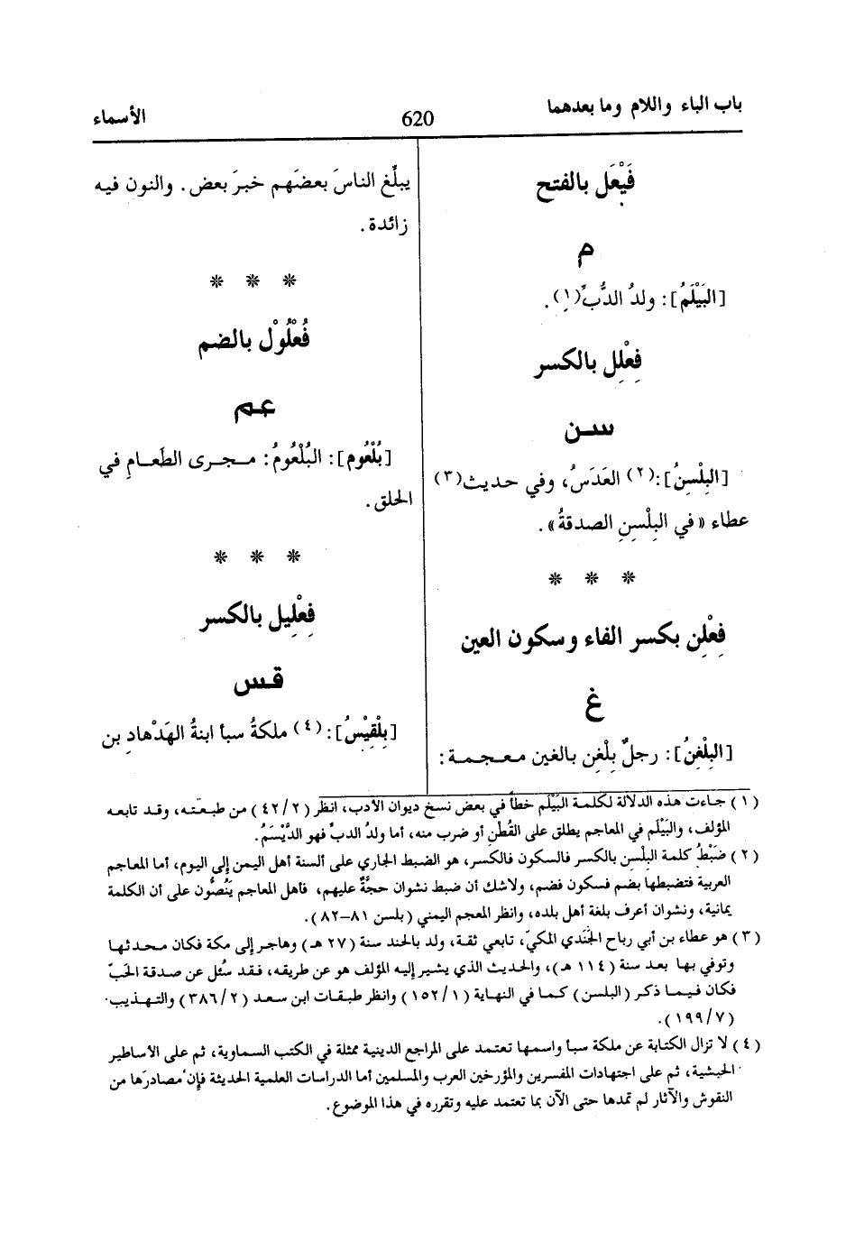 (2) ضَبْطُ كلمة البِلْسِن بالكسر فالسكون فالكسر، هو الضبط الجاري على ألسنة أهل اليمن إِلى اليوم، أما المعاجم العربية فتضبطها بضم فسكون فضم، ولا شك أن ضبط نشوان حجَّةٌ عليهم، فأهل المعاجم يَنُصُّون على أن الكلمة يمانية، ونشوان أعرف بلغة أهل بلده، وانظر المعجم اليمني (بلسن 81 - 82).