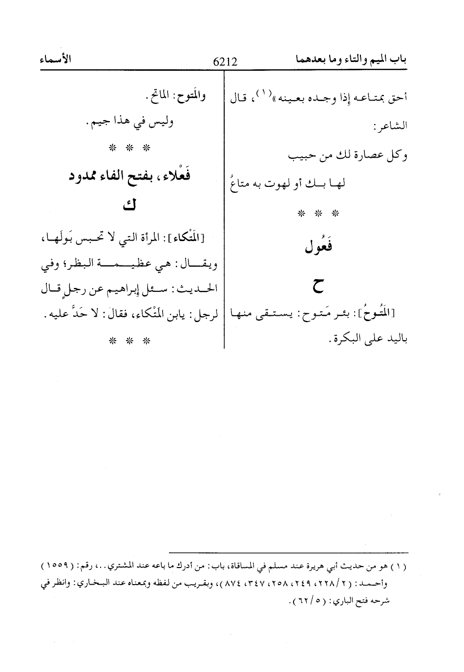 [المَتْكاء]: المرأة التي لا تحبس بَولَها، ويقال: هي عظيمة البظر؛