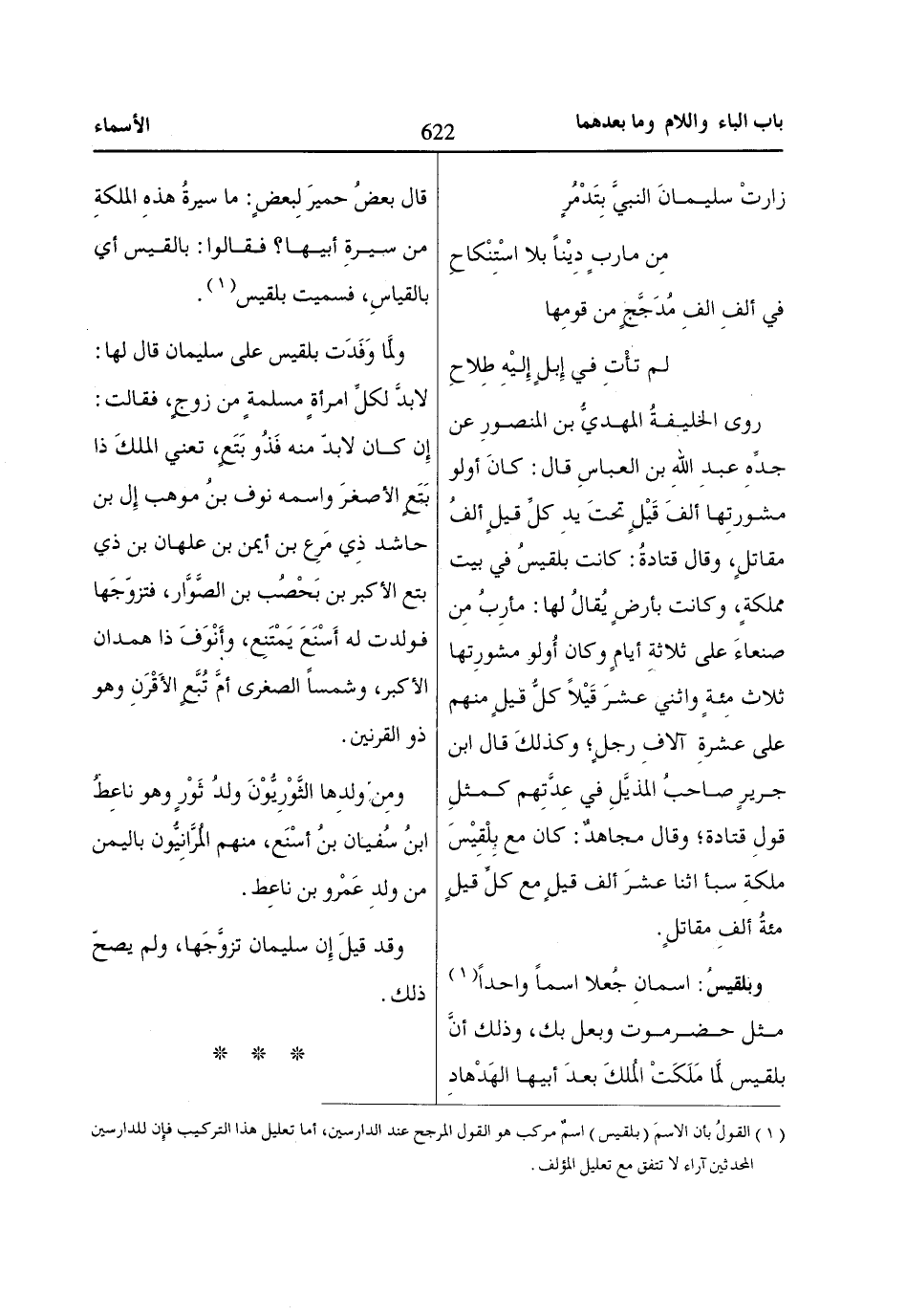 (1) القولُ بأن الاسمَ (بلقيس) اسمٌ مركب هو القول المرجح عند الدارسين، أما تعليل هذا التركيب فإِن للدارسين المحدثين آراء لا تتفق مع تعليل المؤلف.