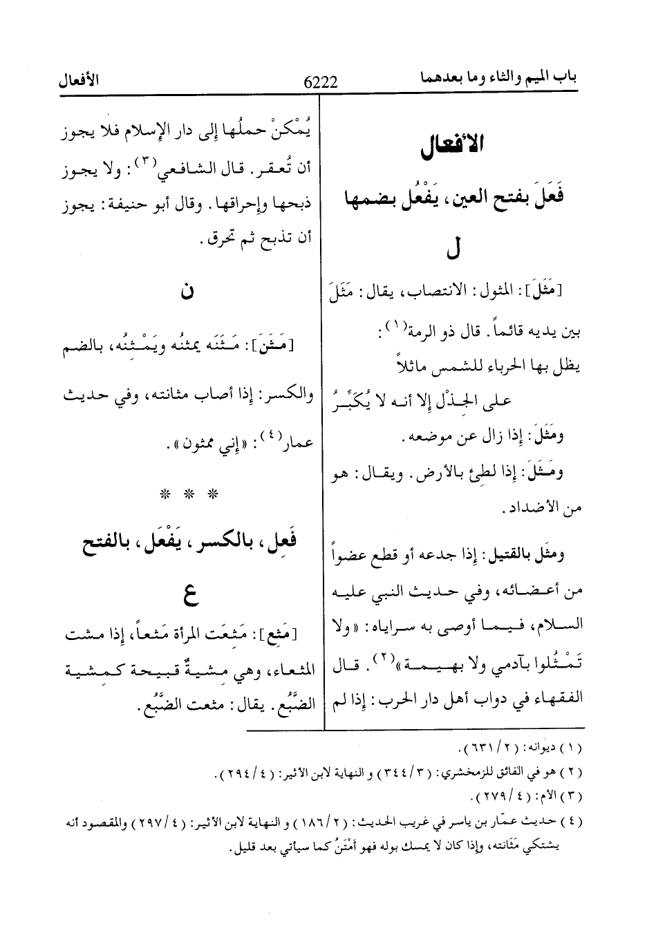 (4) حديث عمّار بن ياسر في غريب الحديث: (2/ 186) والنهاية لابن الأثير: (4/ 297) والمقصود أنه يشتكي مَثَانته، وإِذا كان لا يمسك بوله فهو أَمْتَنُ كما سيأتي بعد قليل.