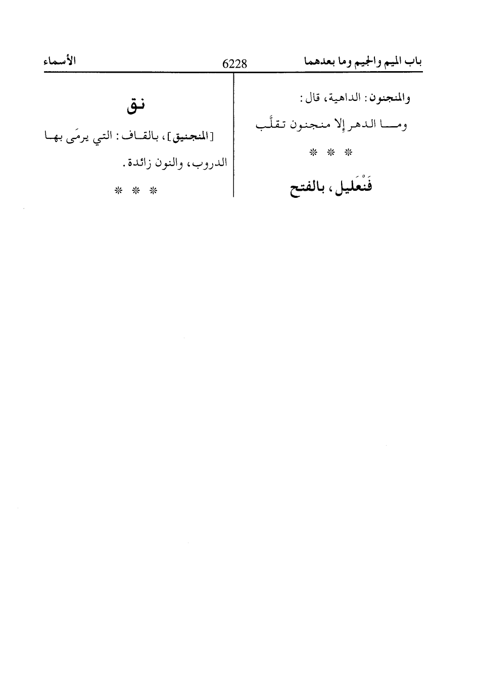 [المنجنيق]، بالقاف: التي يرمَى بها الدروب، والنون زائدة.