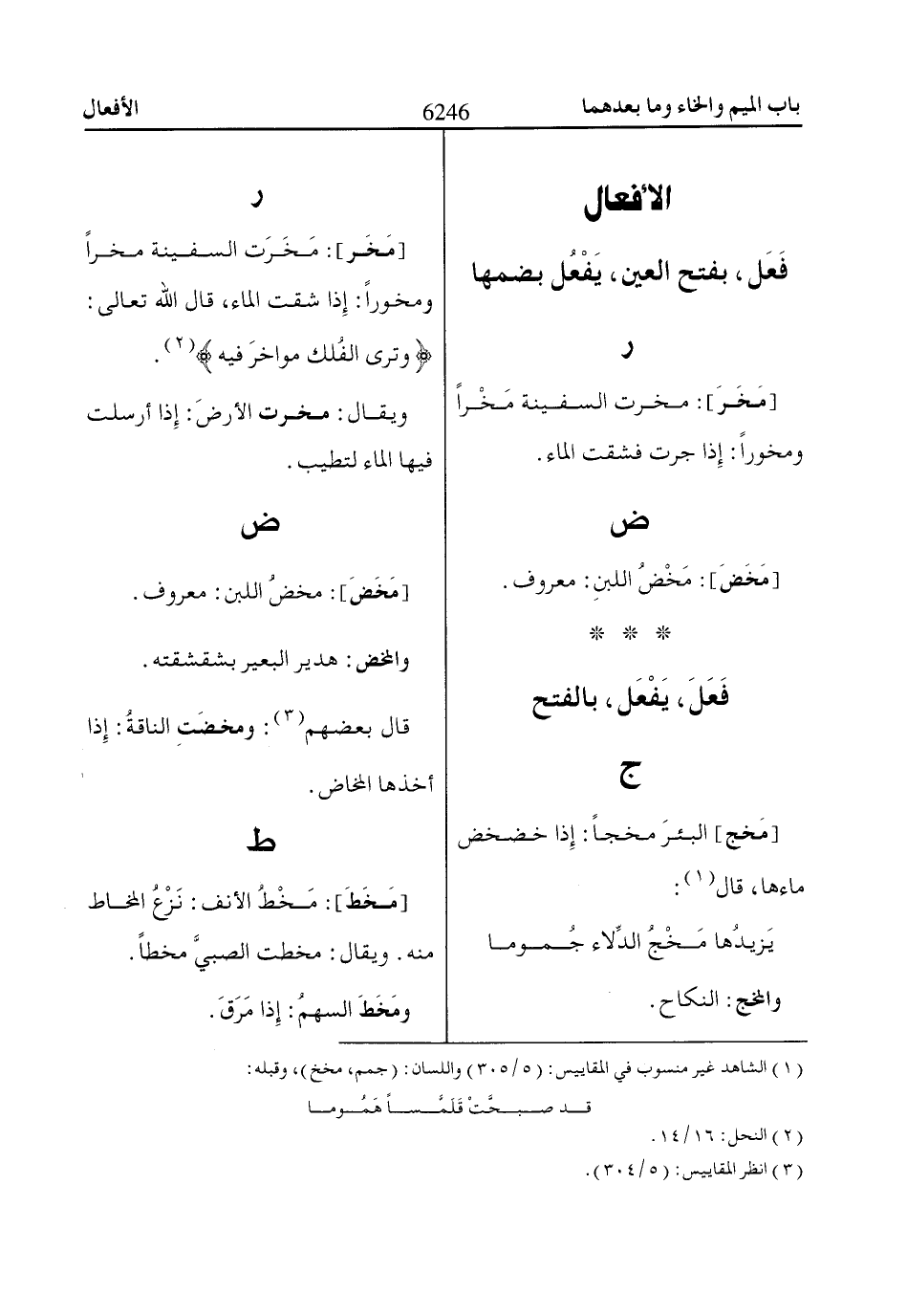 [مَخَر]: مَخَرَت السفينة مخراً ومخوراً: إِذا شقت الماء، قال اللّاه تعالى: