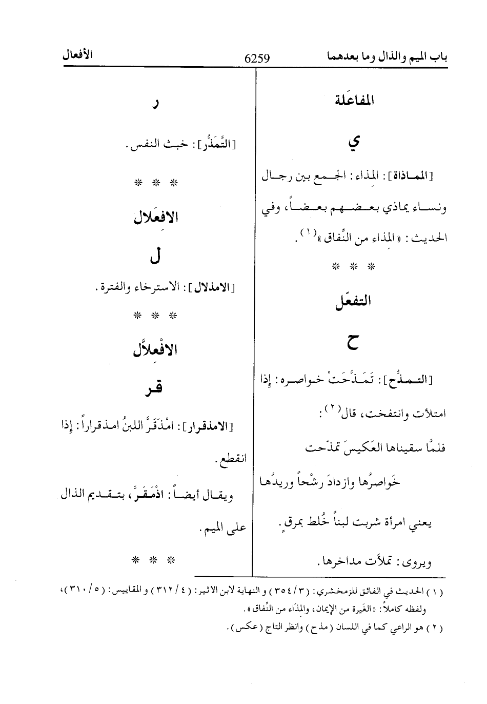 (1) الحديث في الفائق للزمخشري: (3/ 354) والنهاية لابن الأثير: (4/ 312) والمقاييس: (5/ 310)، ولفظه كاملًا: «الغَيرة من الإِيمان، والمِذَاء من النِّفاق».