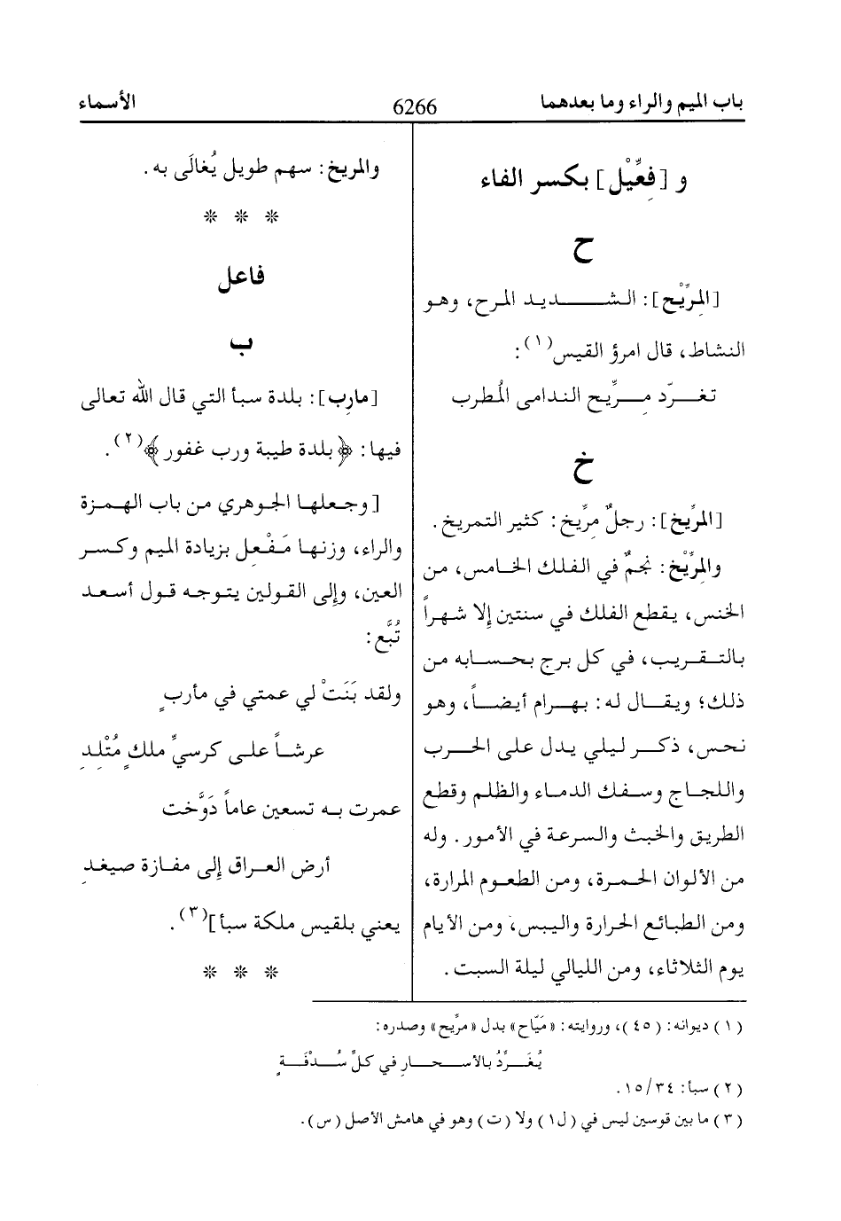 [وجعلها الجوهري من باب الهمزة والراء، وزنها مَفْعِل بزيادة الميم وكسر العين، وإِلى القولين يتوجه قول أسعد تُبَّع: