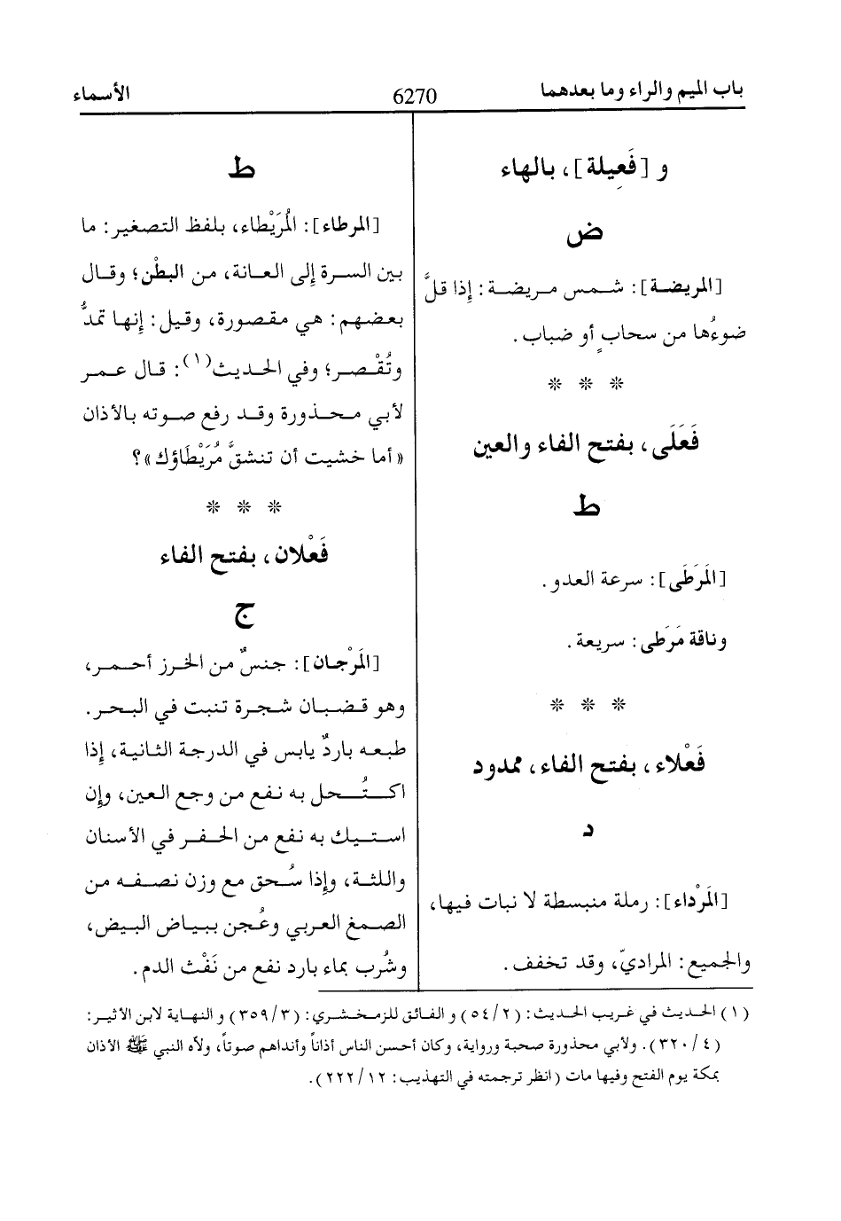 [المرطاء]: المُرَيْطاء، بلفظ التصغير: ما بين السرة إِلى العانة، من البطْن؛ وقال بعضهم: هي مقصورة، وقيل: إِنها تمدُّ وتُقْصر؛ وفي الحديث «1»: