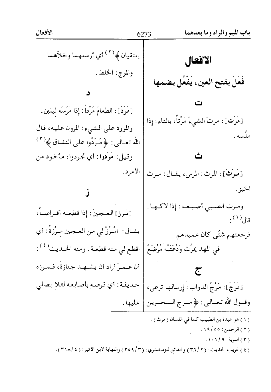 [مَرَجَ]: مَرْجُ الدواب: إِرسالها ترعى، وقول اللّاه تعالى: مَرَجَ الْبَحْرَيْنِ يَلْتَقِياانِ «2» أي أرسلهما وخلّاهما.