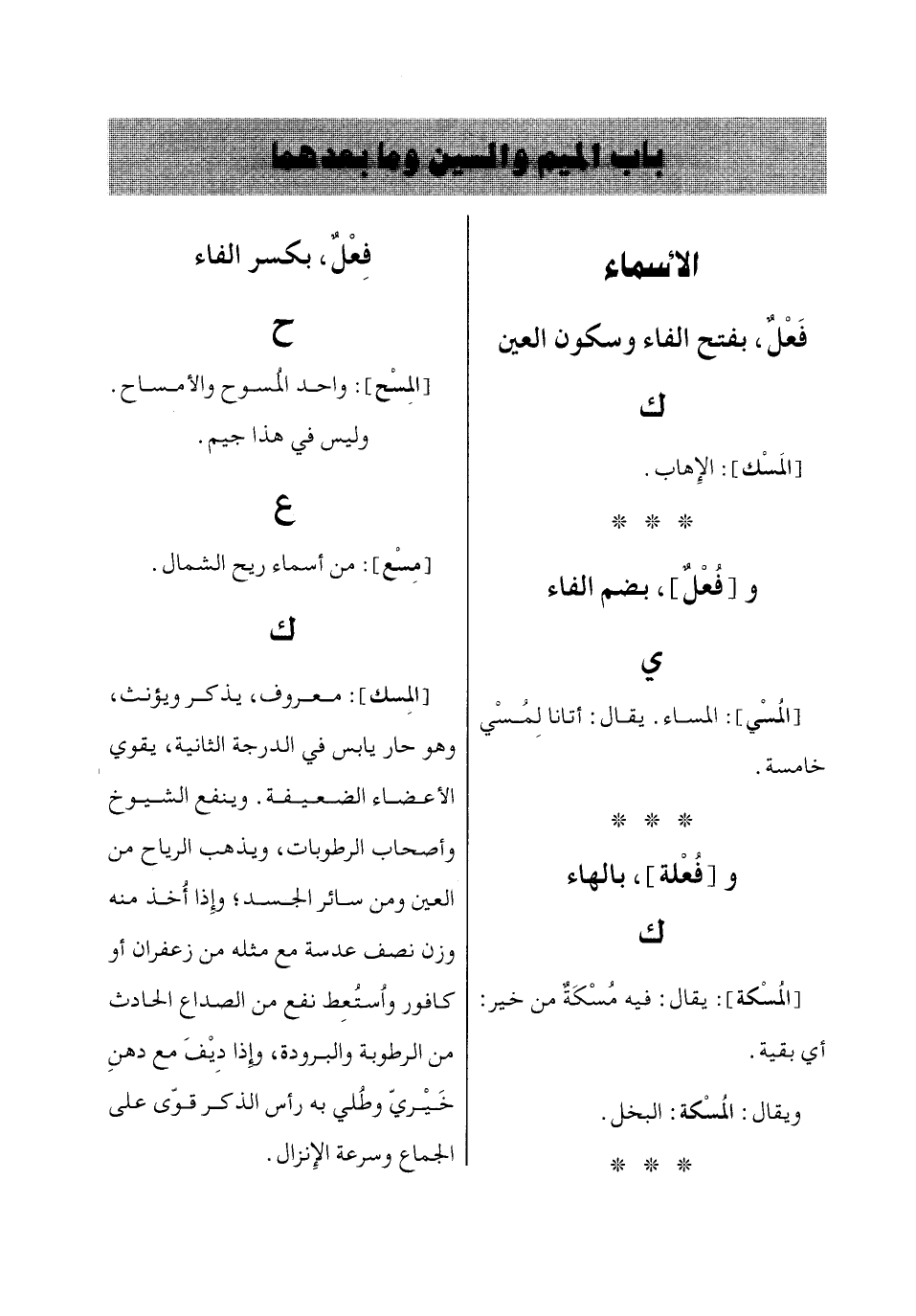 [المِسك]: معروف، يذكر ويؤنث، وهو حار يابس في الدرجة الثانية، يقوي الأعضاء الضعيفة. وينفع الشيوخ وأصحاب الرطوبات، ويذهب الرياح من العين ومن سائر الجسد؛ وإِذا أُخذ منه وزن نصف عدسة مع مثله من زعفران أو كافور واستُعِط نفع من الصداع الحادث من الرطوبة والبرودة، وإِذا دِيْفَ مع دهنِ خَيْريّ وطُلي به رأس الذكر قوّى على الجماع وسرعة الإِنزال.