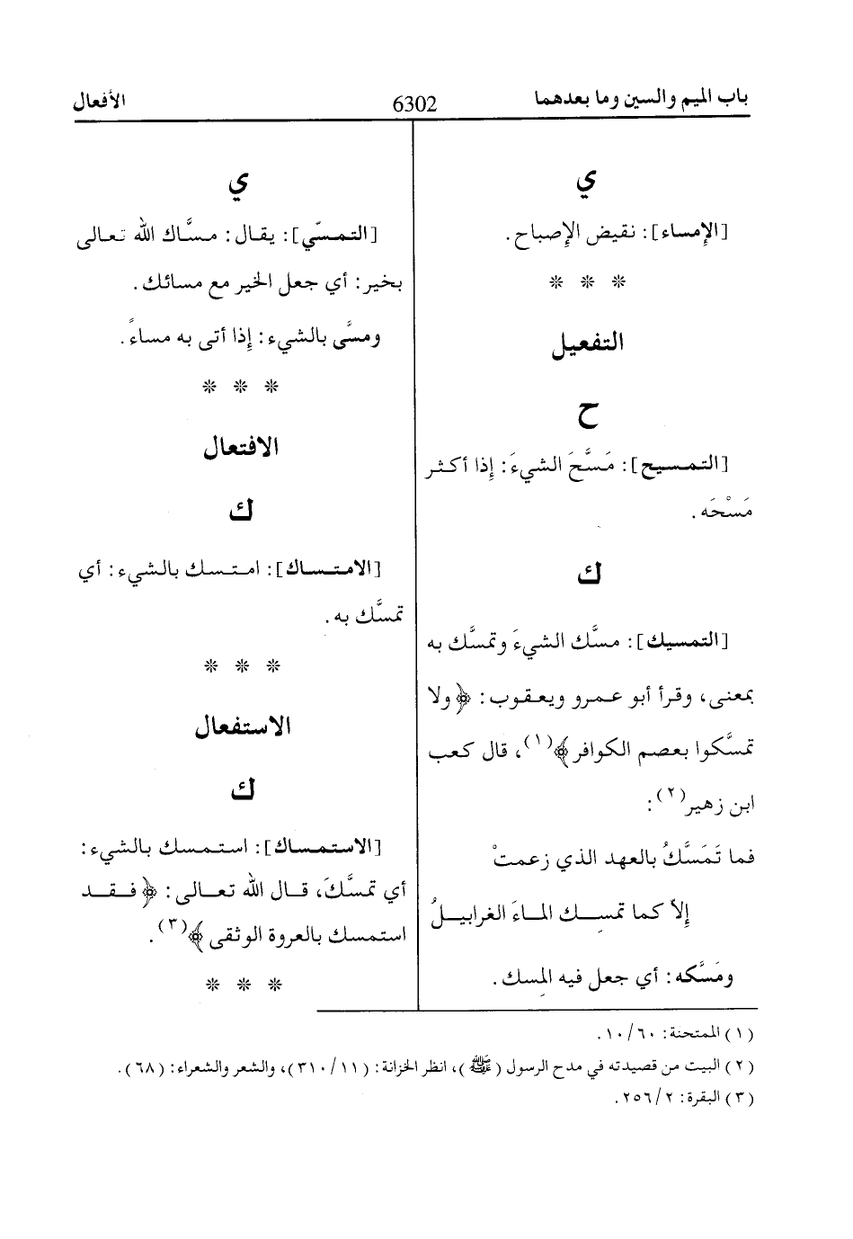 [التمسيك]: مسَّك الشيءَ وتمسَّك به بمعنى، وقرأ أبو عمرو ويعقوب: ولا تُمَسِّكُوا بعصم الكوافر «1»، قال كعب ابن زهير «2»:
